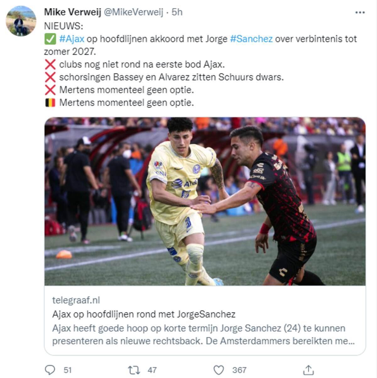 De cara al Mundial Qatar 2022, Jorge Sánchez será futbolista del Ajax hasta el verano del 2027, con un contrato de cinco años, de acuerdo con información de Mike Verweij, reportero de Telegraaf. Por lo pronto, solo falta el anuncio oficial del club.