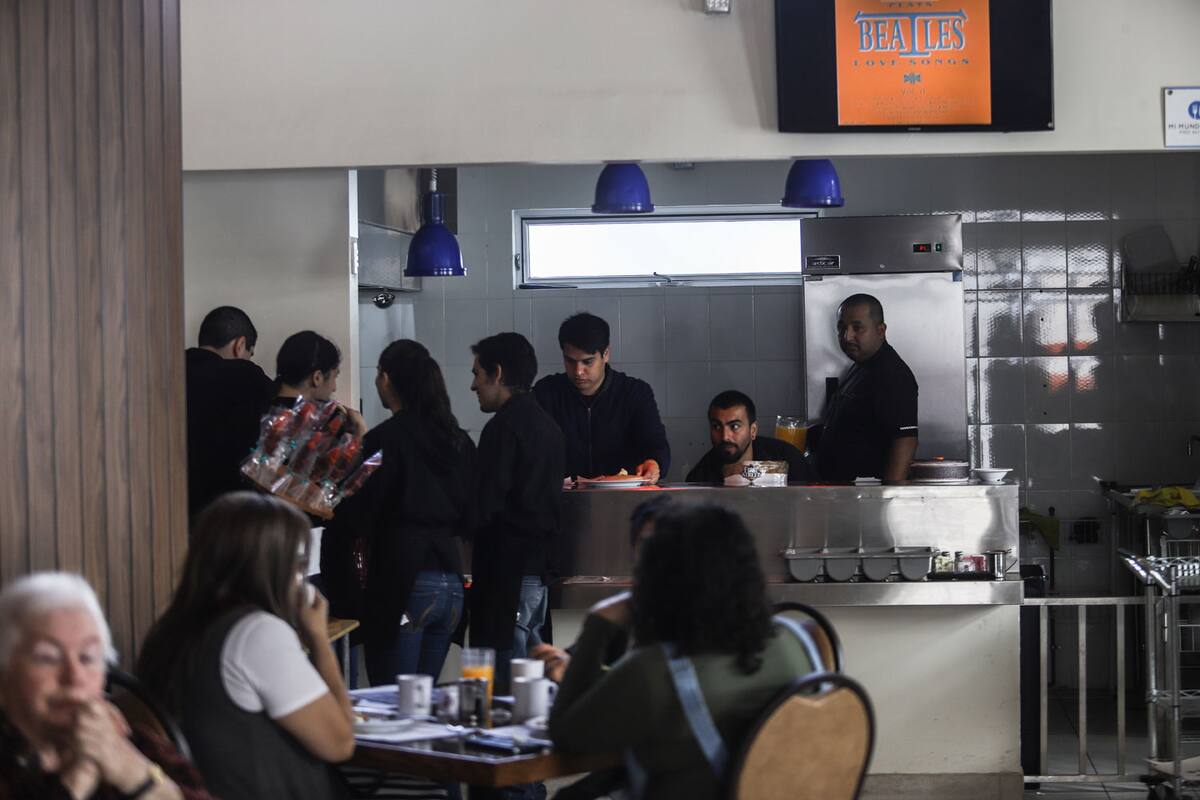 En el restaurante, en medio del bullicio de los comensales, se escuchan los trastes, los meseros gritando al personal de la cocina “¡un café!, ¡otro jugo!”; llevan la comida a la mesa, acomodan los manteles y regresan por más platos con comida.