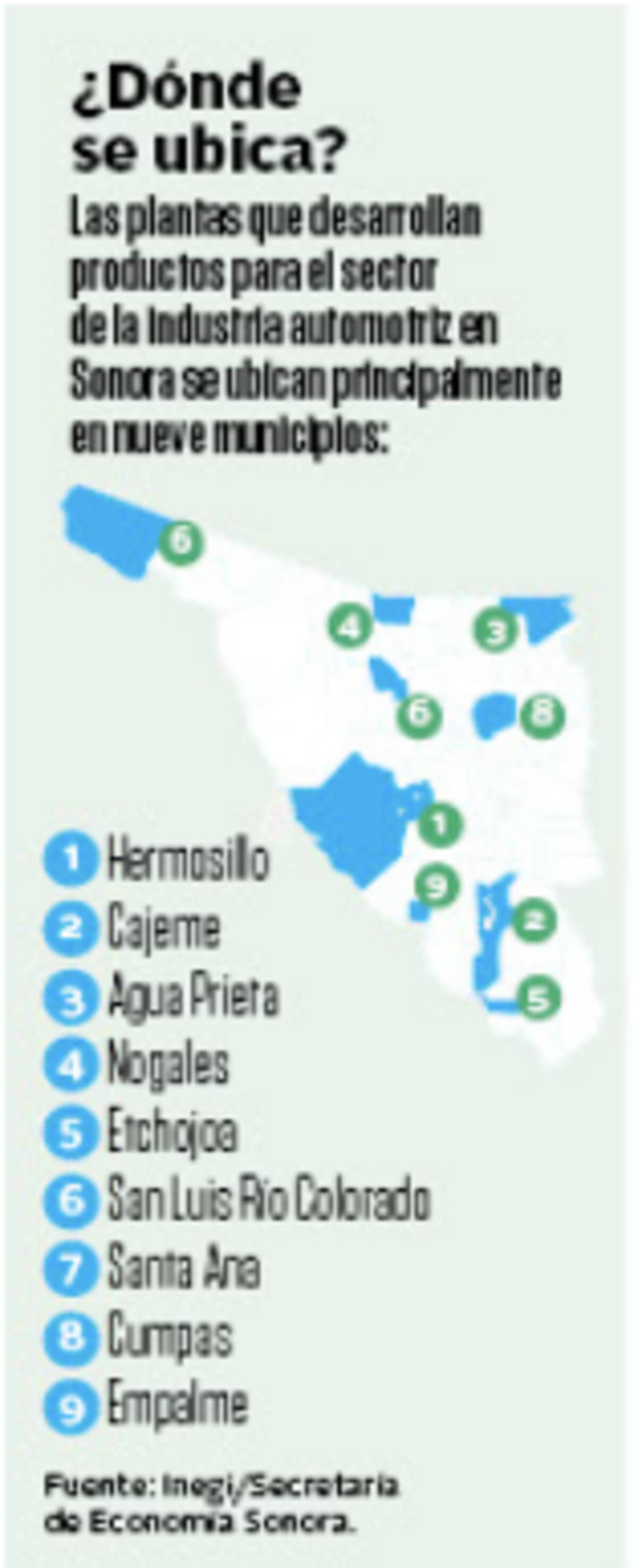 La manufactura está distribuida en trece municipios, principalmente en Hermosillo, pero también en Cajeme, Nogales, Santa Ana, Agua Prieta, Empalme, San Luis Río Colorado, Etchojoa, Cumpas, entre otros.