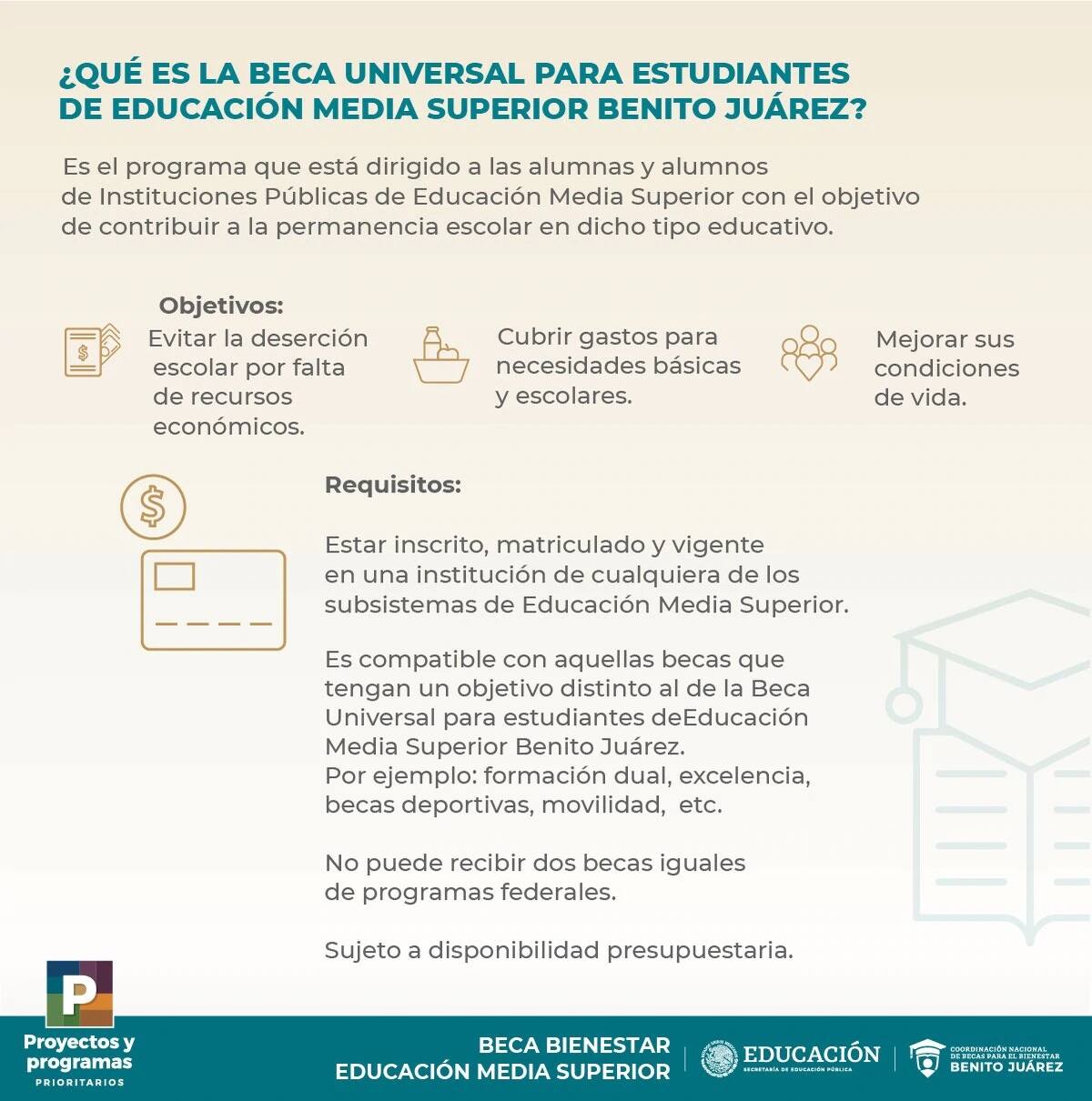 Uno de los programas que las conforman es el denominado Beca Universal para estudiantes de Educación Media Superior Benito Juárez.