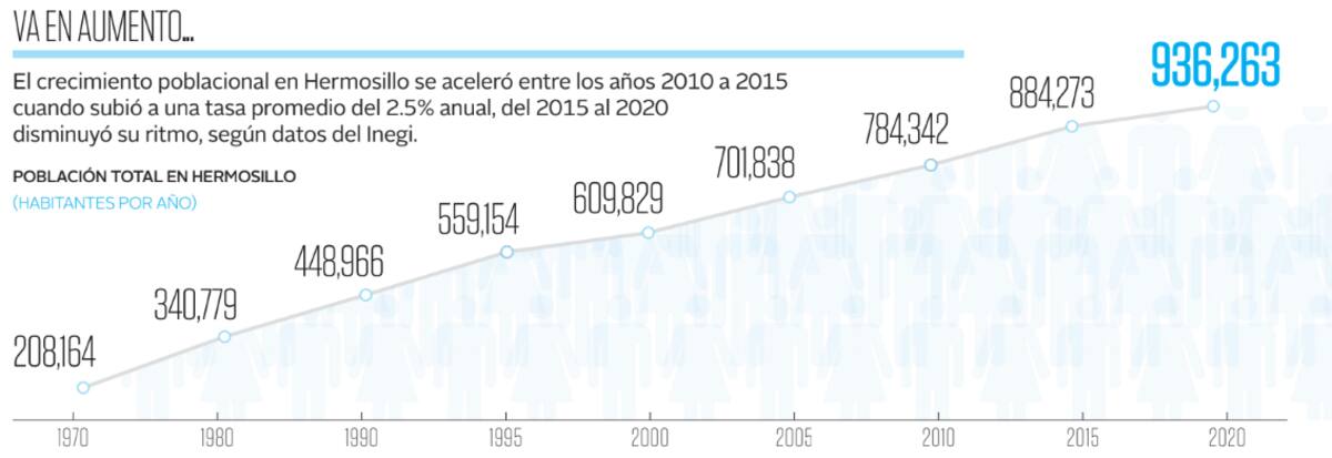 HERMOSILLO Con una tasa de crecimiento superior al 2% en promedio anual, Hermosillo aceleró el aumento de su población entre los años 2000 a 2015, periodo en el que sumó casi los 900 mil