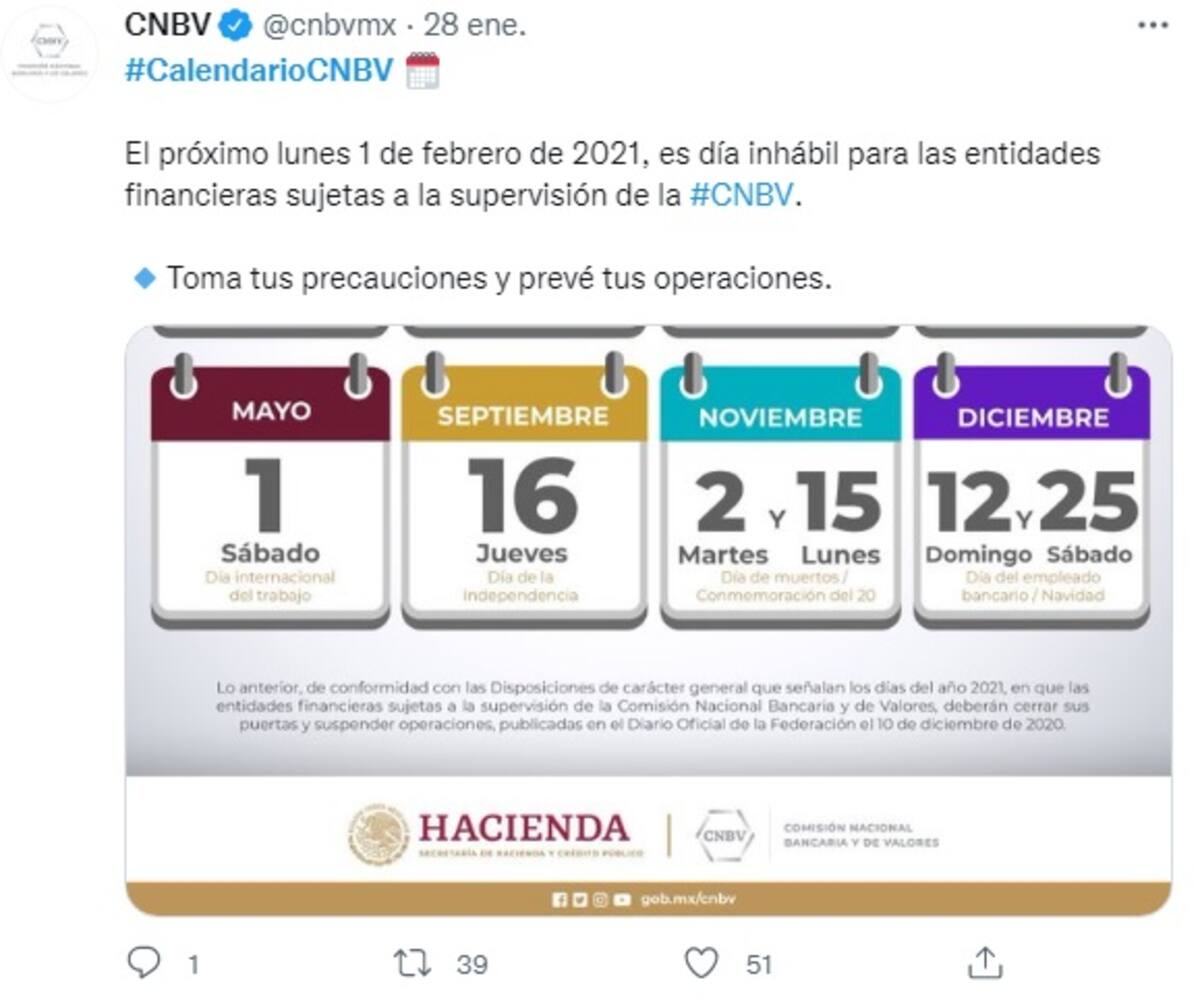 Al respecto, la Comisión Nacional Bancaria de Valores (CNBV), emitió el calendario de días feriados en México, donde se especifica los días en que trabajadores bancarios y las sucursales no brindarán servicios.