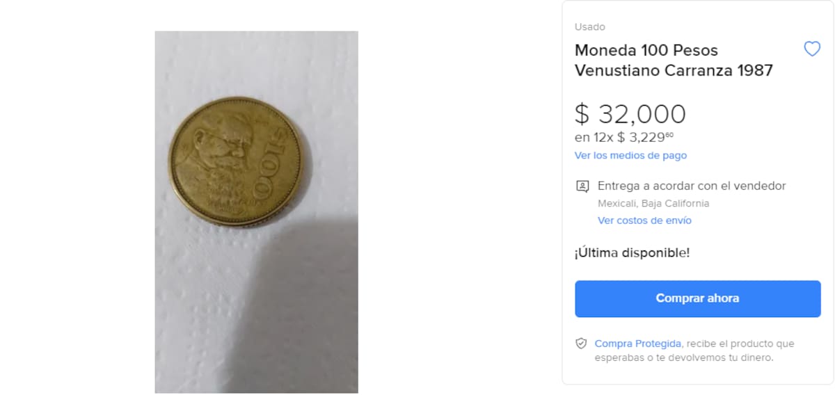 La <strong>moneda de 100 pesos</strong> del año <strong>1987</strong> y con la imagen de <strong>Venustiano Carranza</strong> se oferta hasta en <strong>32 mil pesos </strong>en internet.