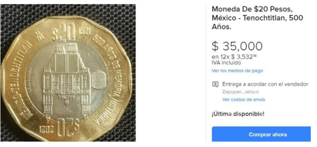 Respecto a la moneda que se encuentra a la venta en Mercado Libre por 35 mil pesos, esta contiene la imagen del Templo Mayor y un microtexto en el que se lee “Fusión Cultural”.