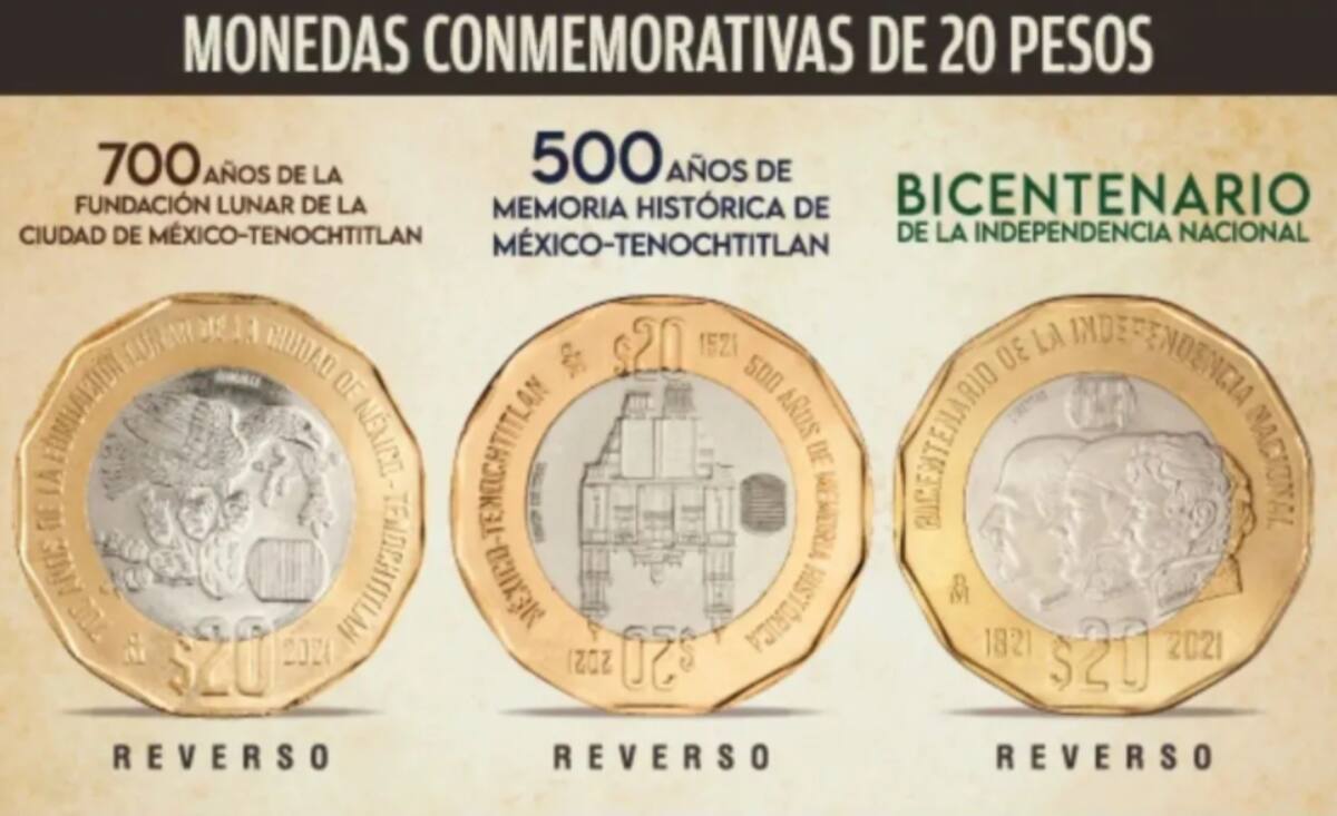 Las tres monedas bimétalicas de 20 pesos, como las tres monedas de plata que tienen un valor de 10 pesos, se pusieron en circulación el 27 de septiembre pasado para conmemorar el Bicentenario de la Independencia y la fundación y caída de Tenochtitlan.