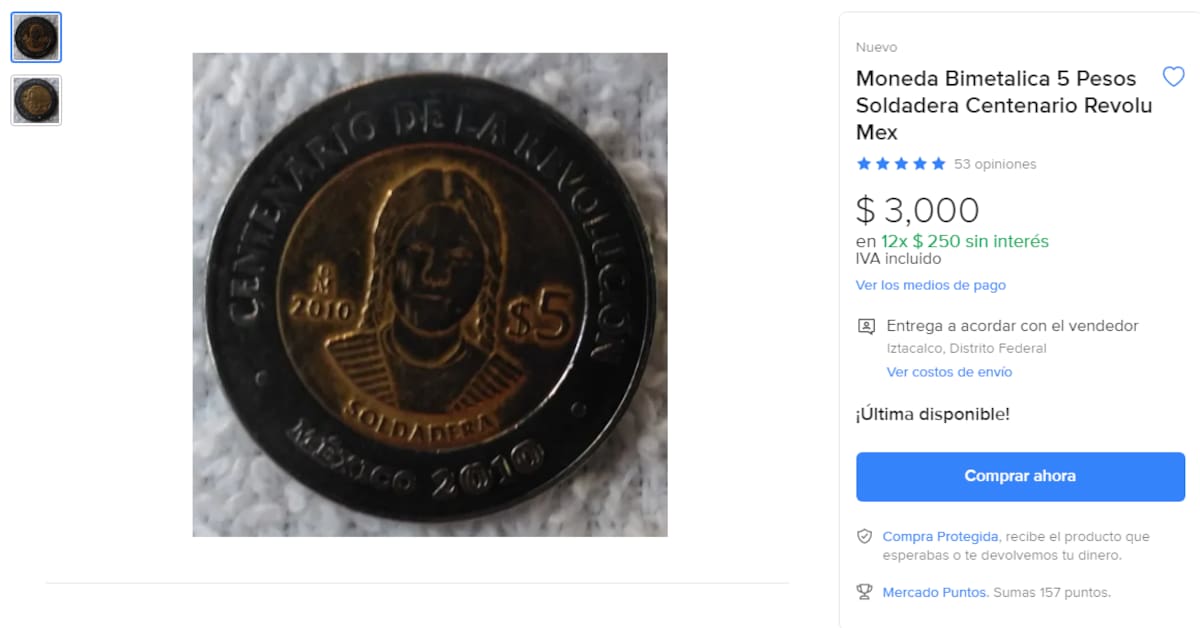 De acuerdo con la descripción del vendedor de Mercado Libre respecto a la moneda de 5 pesos con la imagen de “La Soldadera”, esta es una moneda bimetálica emitida en 2010 para conmemorar el Centenario de la Revolución de 1910, la cual se encuentra en “excelentes condiciones”.