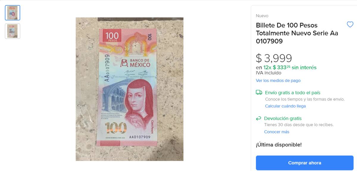 En el sitio de ventas por internet, Mercado Libre, se encuentra a la venta un nuevo billete de 100 pesos en 3 mil 999 pesos, esto debido a que su número de serie es AA0107909.