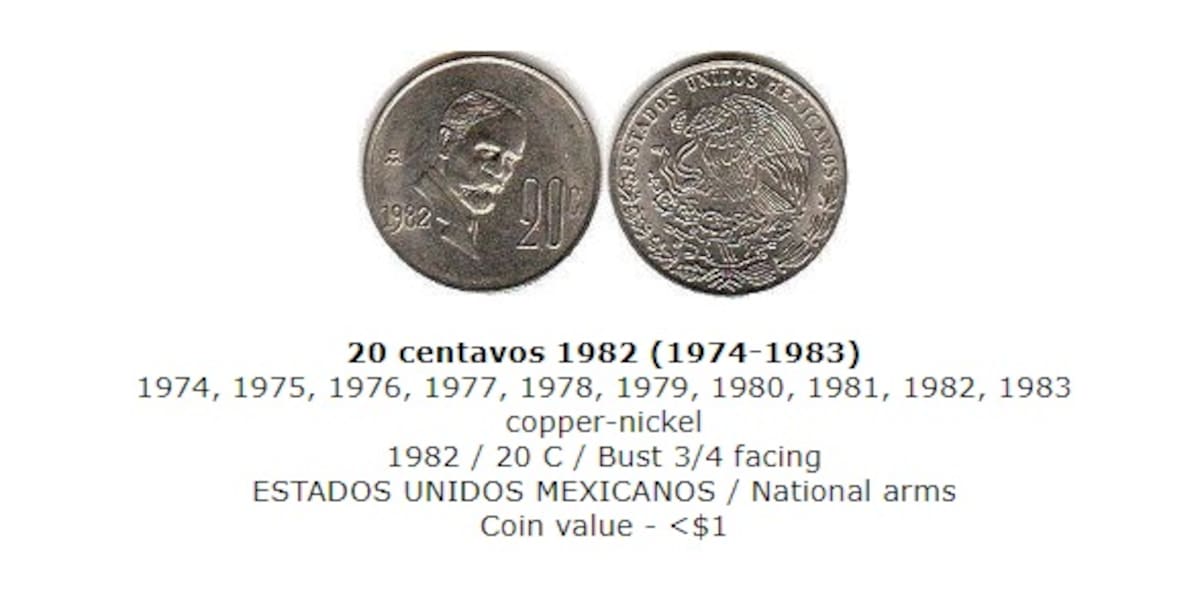 Tal es el caso de la moneda de 20 centavos de Francisco I. Madero la cual pertenece a la familia AA, y que fue acuñada en 1974 por el Banco de México (Banxico). Para diciembre de 1992 comenzó su proceso de retiro.