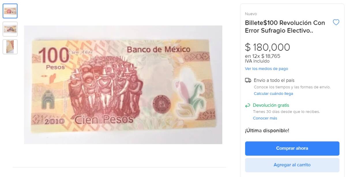 Tal es el caso de un billete de 100 pesos que conmemora el inicio de la Revolución Mexicana, que debido a un supuesto error de fabricación, se ofrece por 180 mil pesos en la página de mercado libre.