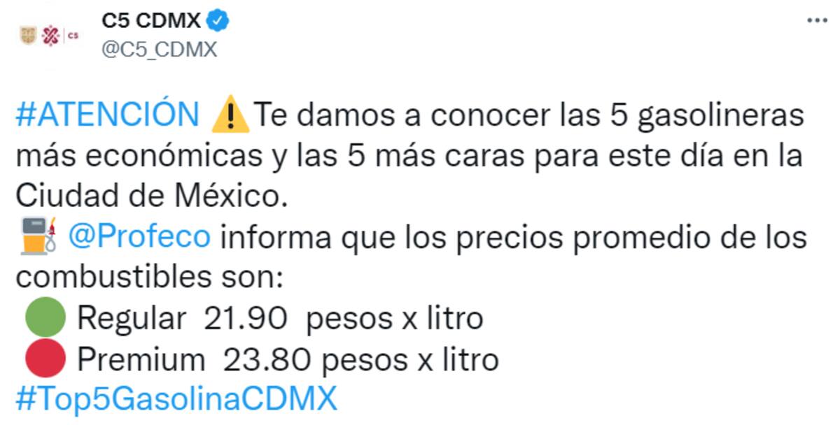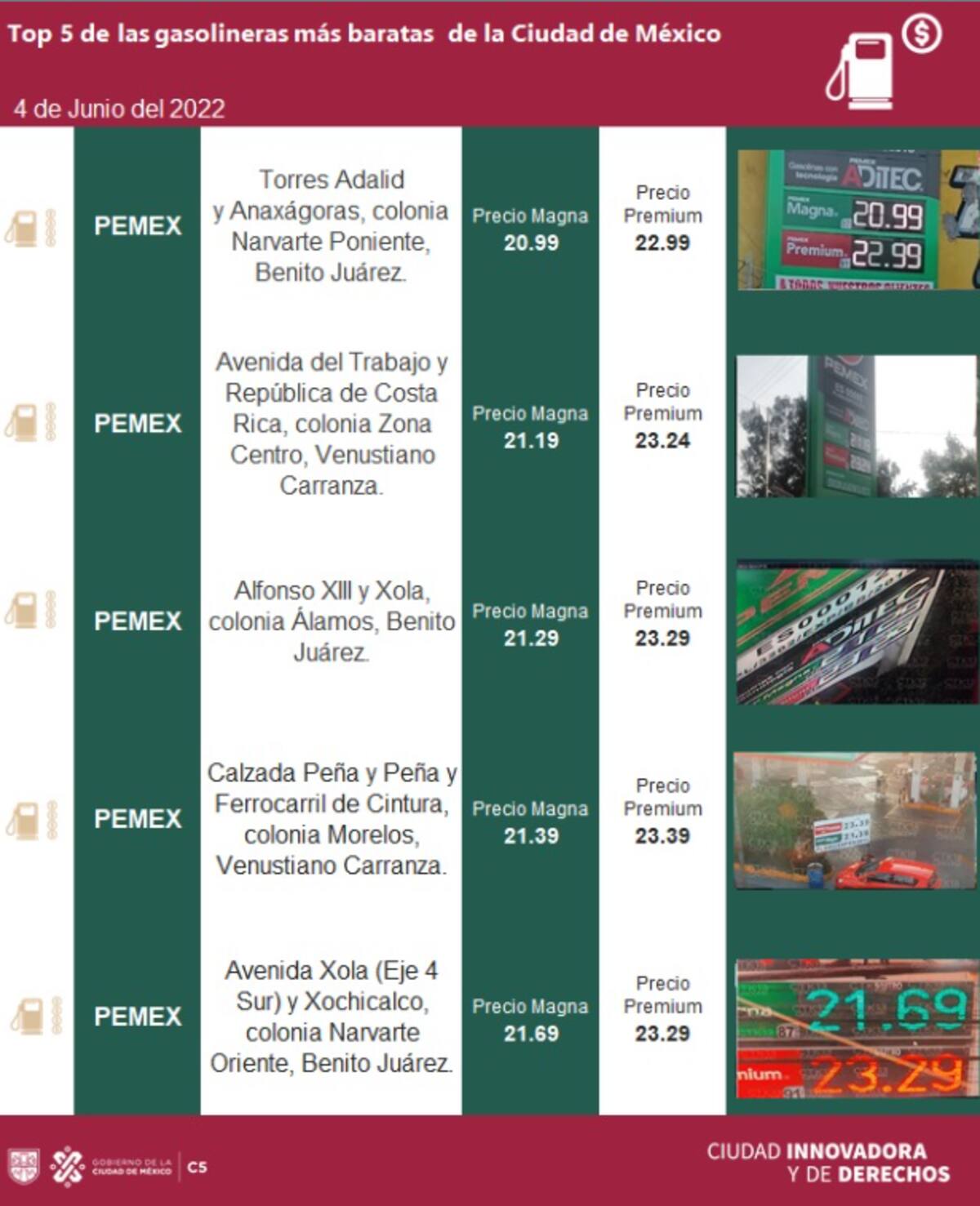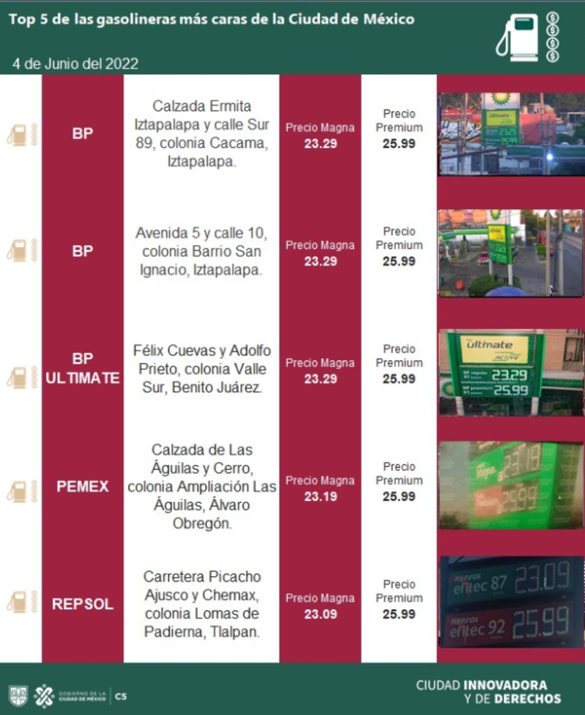 Respecto a la ubicación de las gasolineras más caras el día del hoy en la CDMX, el C5 indicó que se encuentran en: