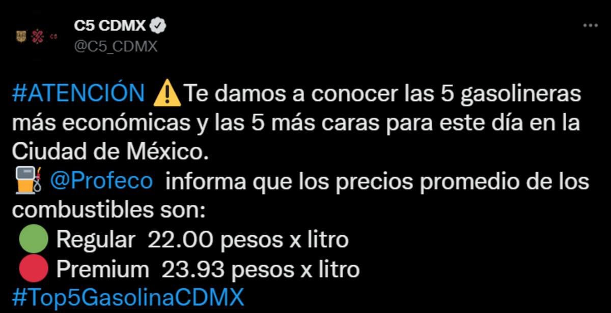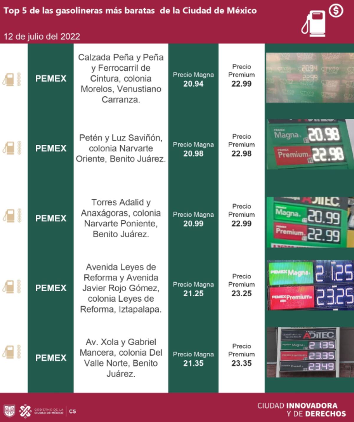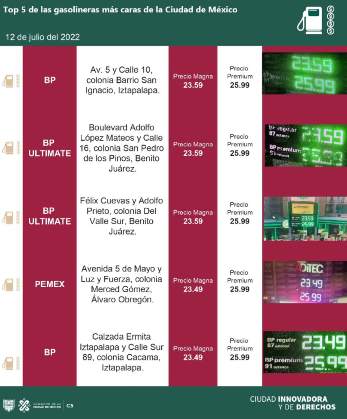 Respecto a la ubicación de las gasolineras más caras el día del hoy en la CDMX, el C5 indicó que se encuentran en: