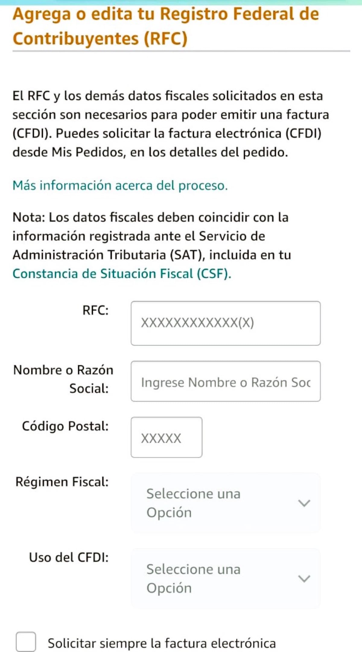 Registrar tu RFC: Si es la primera vez que el usuario realiza una compra con la intención de generar una factura, deberá registrar su RFC en el sistema de Amazon. Este paso es necesario para garantizar la validez fiscal de la factura.