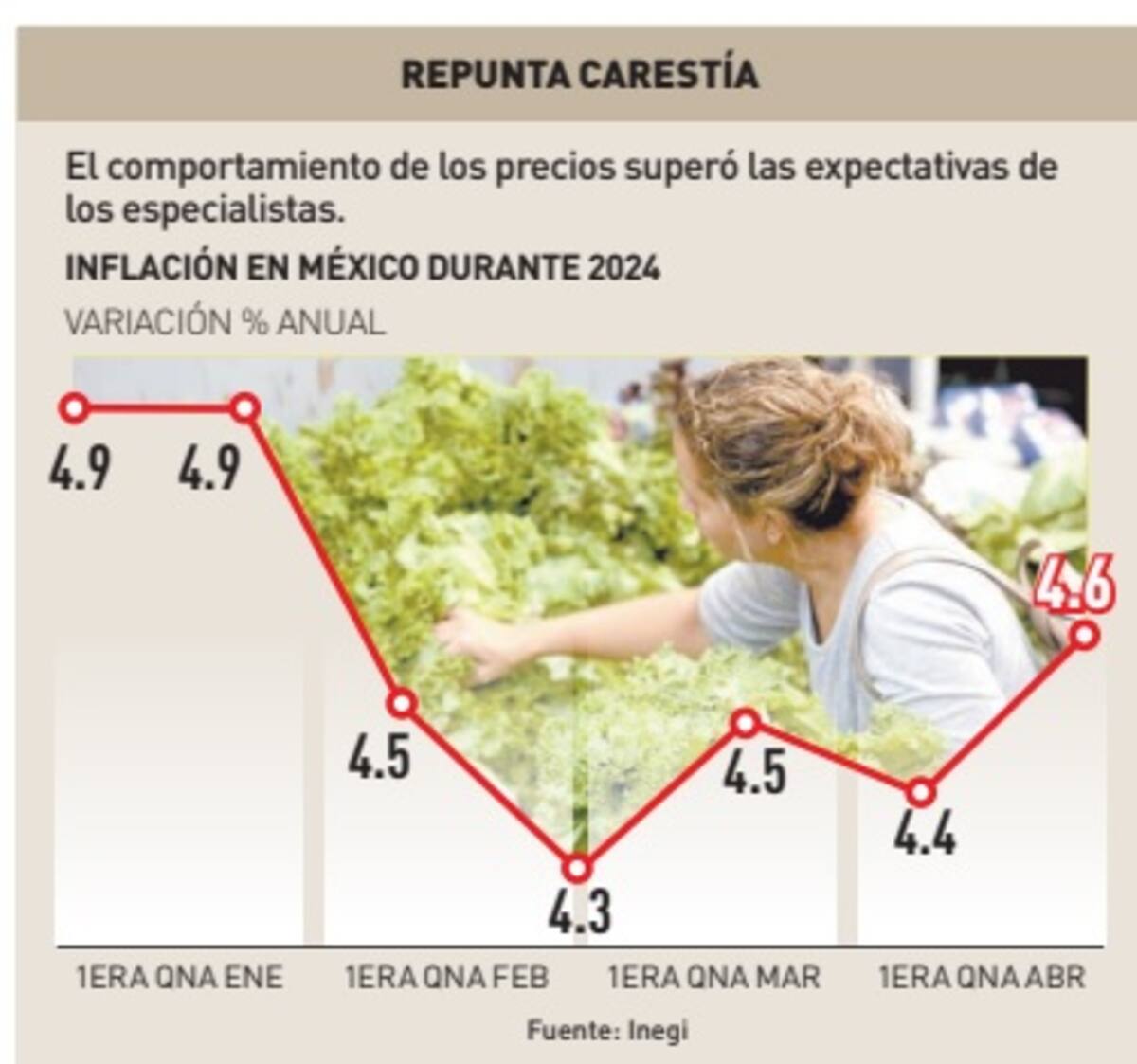 El incremento general de precios en la primera quincena de abril se ubicó por arriba del consenso de los analistas que era de 4.47% anual, superando incluso el rango de sus expectativas que iban de un mínimo de 4.28% a un máximo de 4.62% previsto por las 31 instituciones financieras consultadas por CitiBanamex.