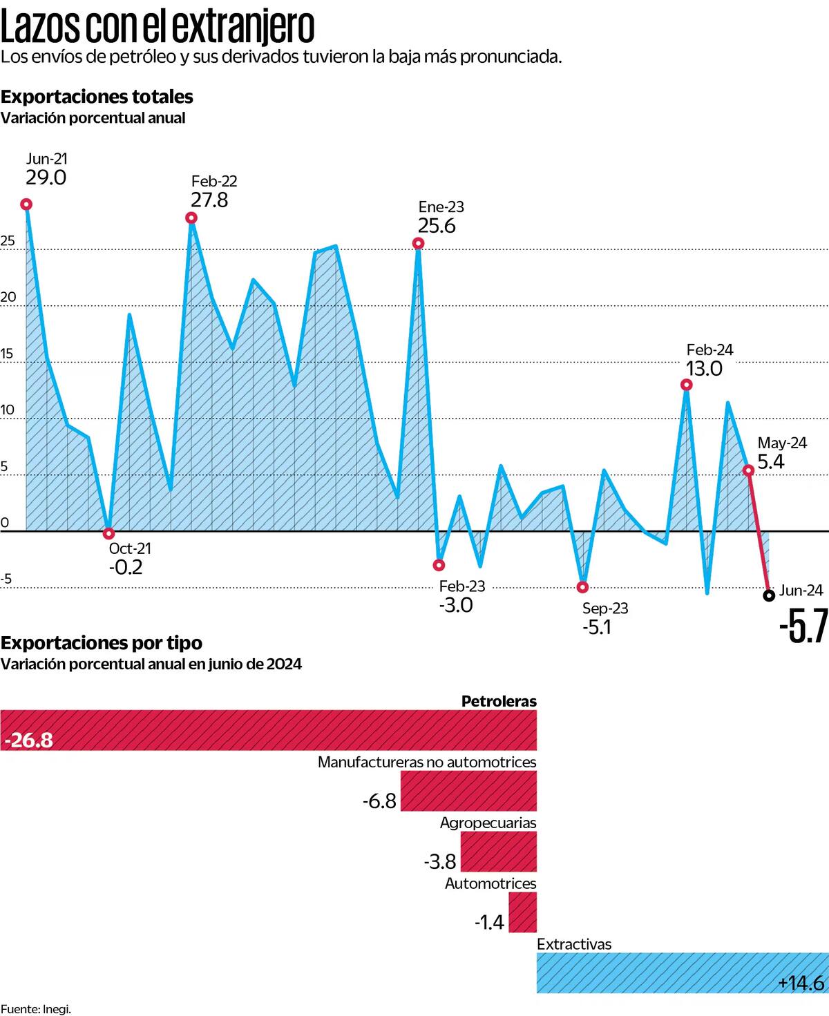 Las exportaciones de petróleo y sus derivados se vieron especialmente afectadas, registrando una reducción del 26.8 por ciento. Esto se atribuye principalmente a menores volúmenes y precios del crudo nacional. Asimismo, las ventas de productos agropecuarios disminuyeron un 3.8 por ciento, debido en parte a la suspensión temporal de exportaciones de aguacate y mango de Michoacán hacia Estados Unidos. Por otro lado, la industria automotriz y otros productos manufacturados etiquetados como Made in Mexico también reportaron cifras negativas, con caídas del 1.4 por ciento y 6.8 por ciento, respectivamente.