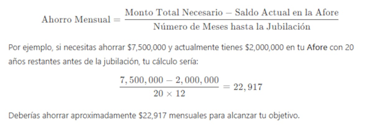 Para determinar el monto total que necesitas ahorrar, considera la duración esperada de tu jubilación y el rendimiento de tu Afore. Utiliza la siguiente fórmula básica: