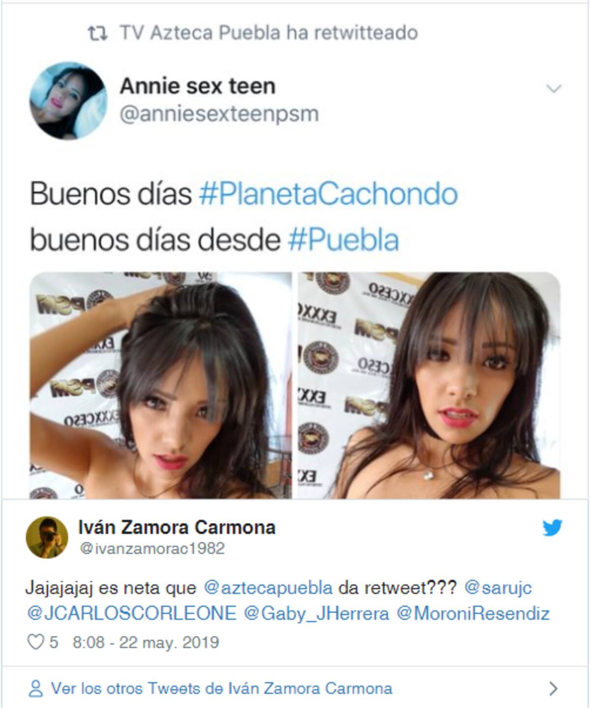 PUEBLA.-En un escándalo se vio envuelto el empleado que maneja las redes sociales de TV Azteca en Puebla, luego de dar retuit a la competencia y a una actriz pornográfica.
