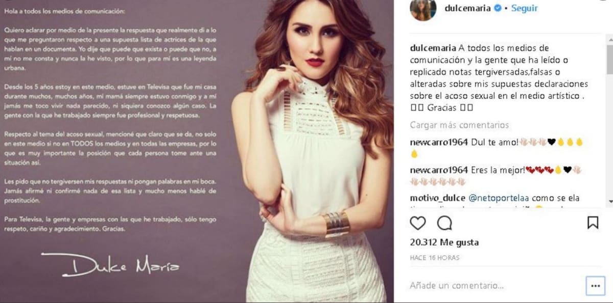 Dulce María también fue otra de las actrices que decidió expresarse al respecto. Lo hizo mediante la revista People en Español señalando que el acoso sexual en Televisa es ‘‘de esas cosas que pasan en el medio’’. Aseguró que ella nunca se ha prestado a una situación que comprometiera su integridad.