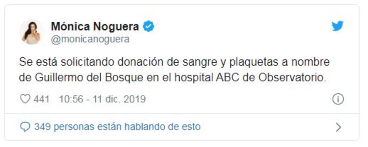 Guillermo del Bosque se encuentra hospitalizado o al menos así lo refiere un mensaje que publicó Mónica Noguera durante la mañana de este miércoles, donde solicita donadores de sangre y plaquetas para el productor mediante su cuenta de Twitter.