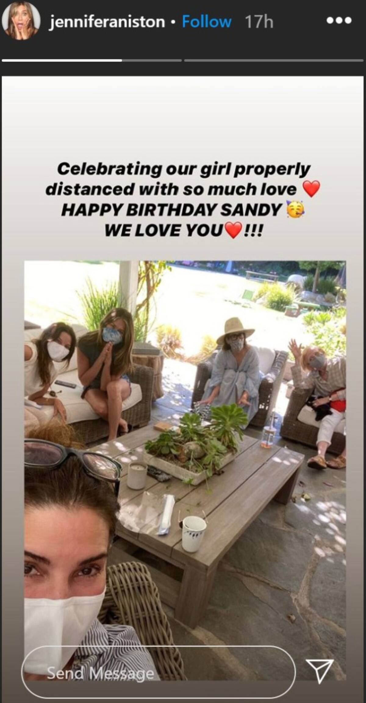“Celebramos a nuestra chica tomando la distancia física adecuada y con mucho amor”, escribió Jennifer Aniston sobre la foto. “Feliz cumpleaños, Sandy. ¡Te amamos!”, agregó la protagonista de la serie ‘Friends’, sobre una imagen que compartió en sus Instagram Stories.