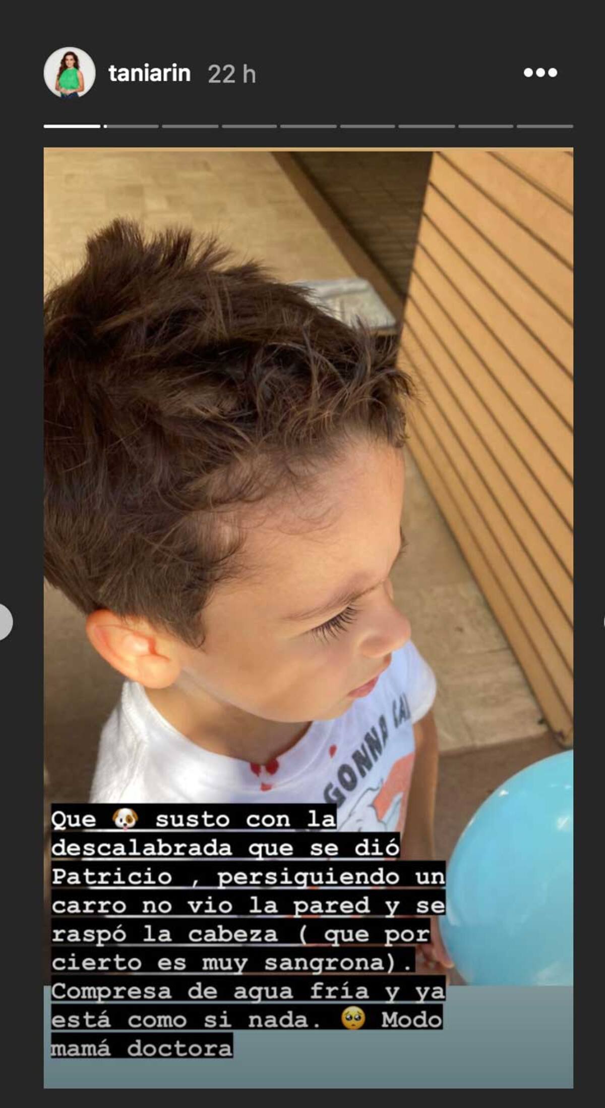 Qué susto con la descalabrada que se dio Patricio, persiguiendo un carro no vio la pared y se raspó la cabeza (que por cierto es muy sangrona)”, explicó Tania.