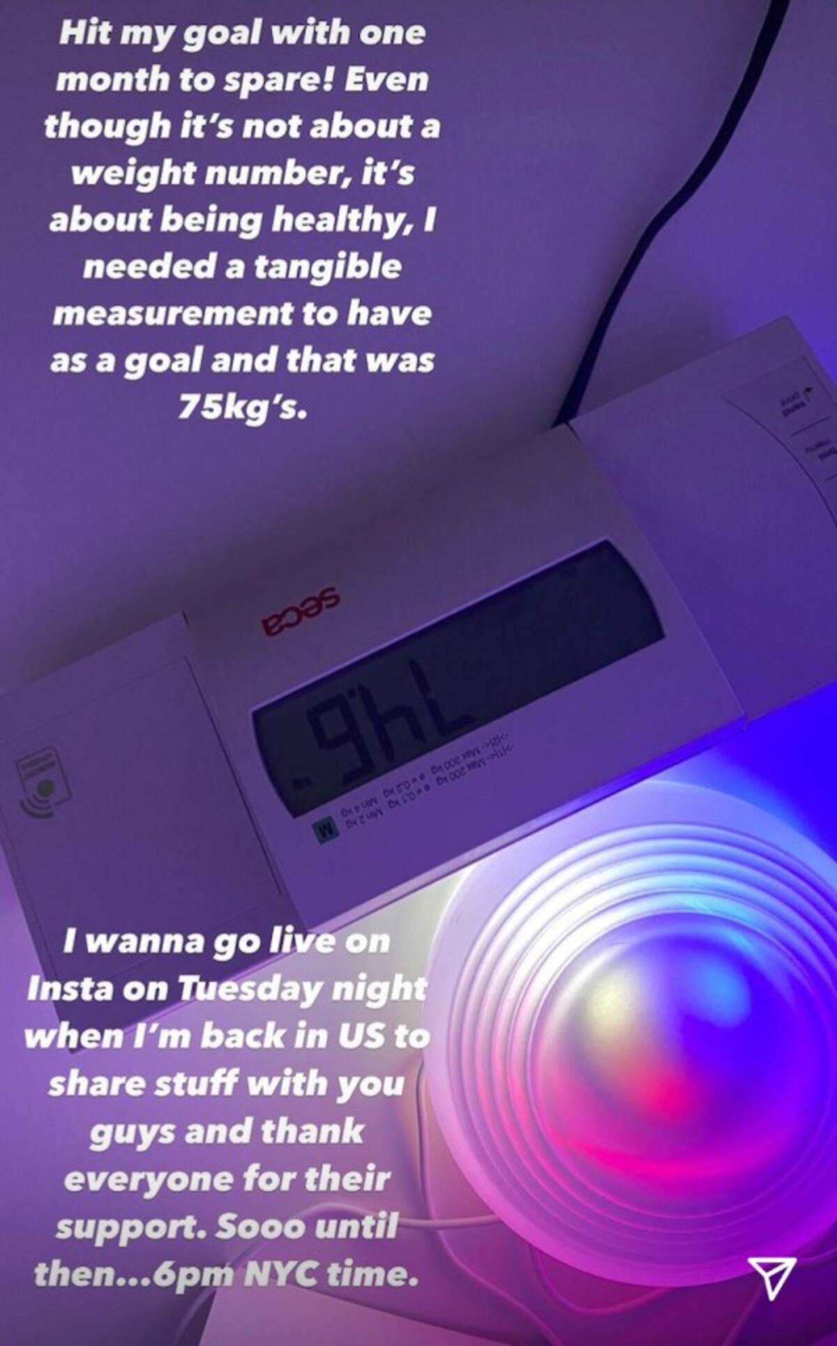"Llegué a la cifra que quería, y con un mes de adelanto. Aunque lo importante no es un número en la báscula, sino sentirse sano, yo necesitaba una medida concret para marcarme un reto, y ese era llegar a los 75 kilos", explicó Rebel Wilson en sus stories.
