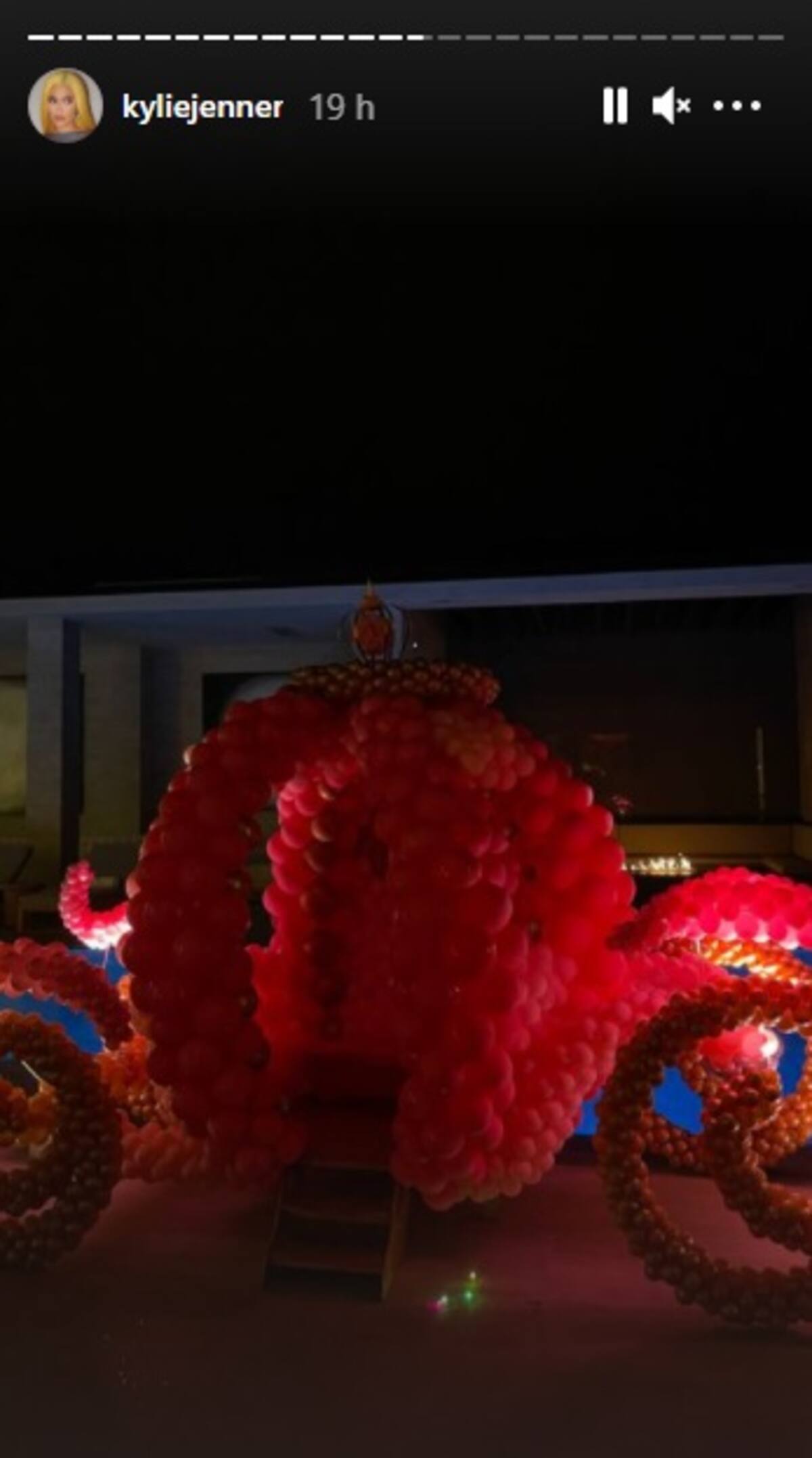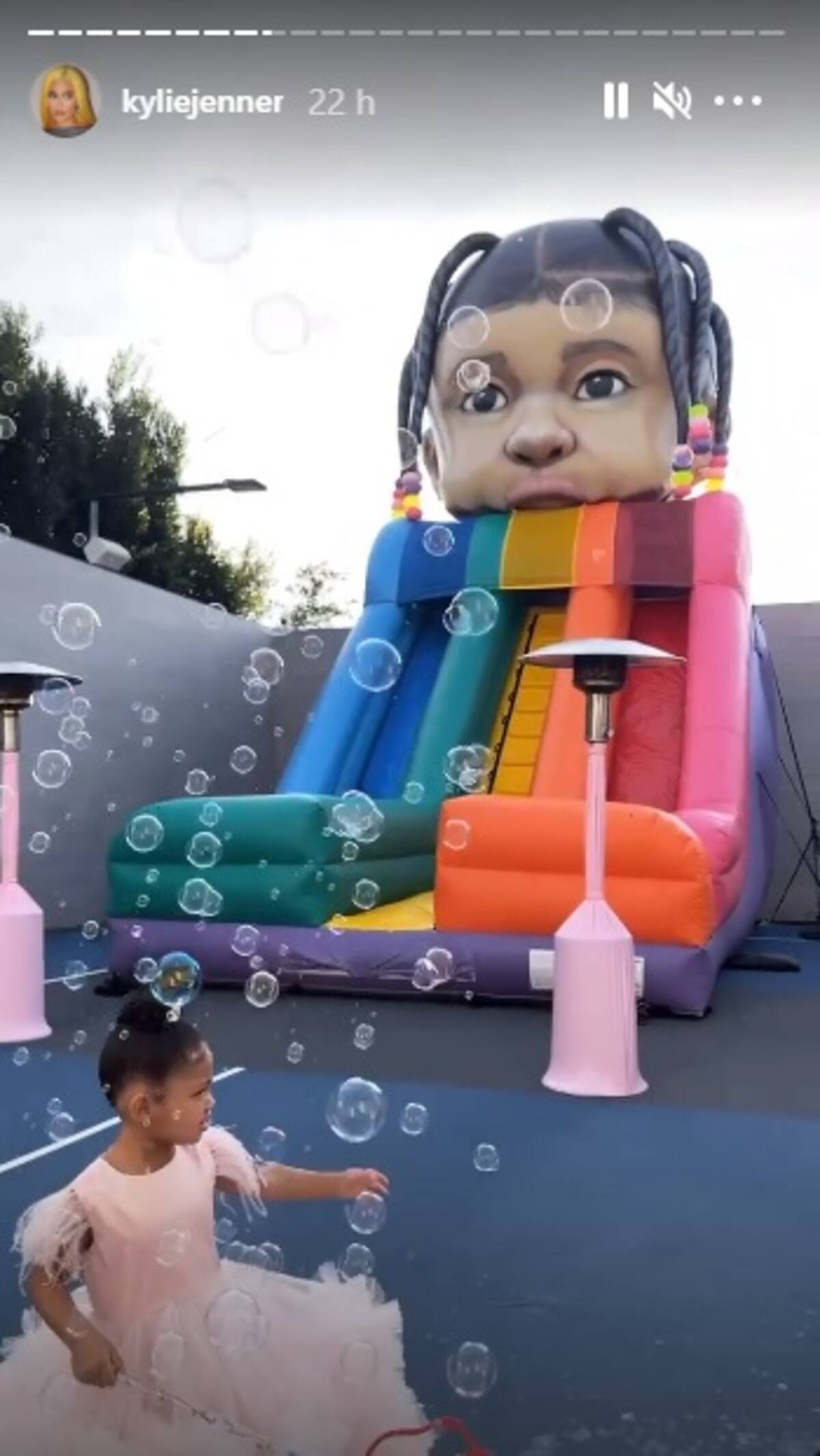 En el exterior de la casa no podía faltar el carruaje de la princesa, estilo “Cenicienta”, hecho con globos de color rosa. El área del jardín se instaló un “brincolín” inflable con la cara de Stormi en la cima, con sus características trencitas y ligas de colores.