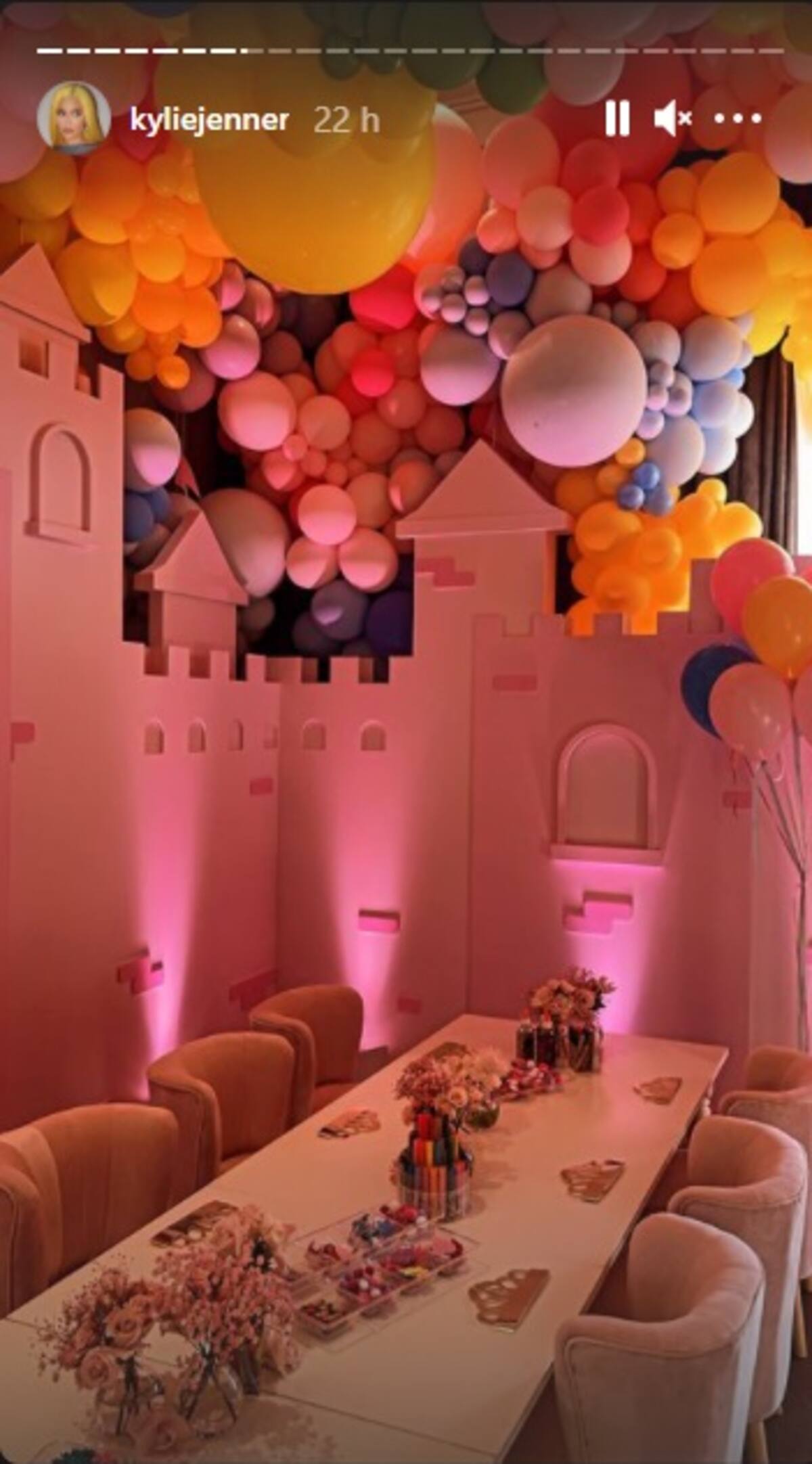 Kylie Jenner fue quien compartió en sus historias de Instagram cada detalle sobre la fiesta, en la que hubo todo tipo de golosinas y postres, comida, bebidas, globos y un enorme pastel en forma de castillo, ya que la temática fue de princesa.