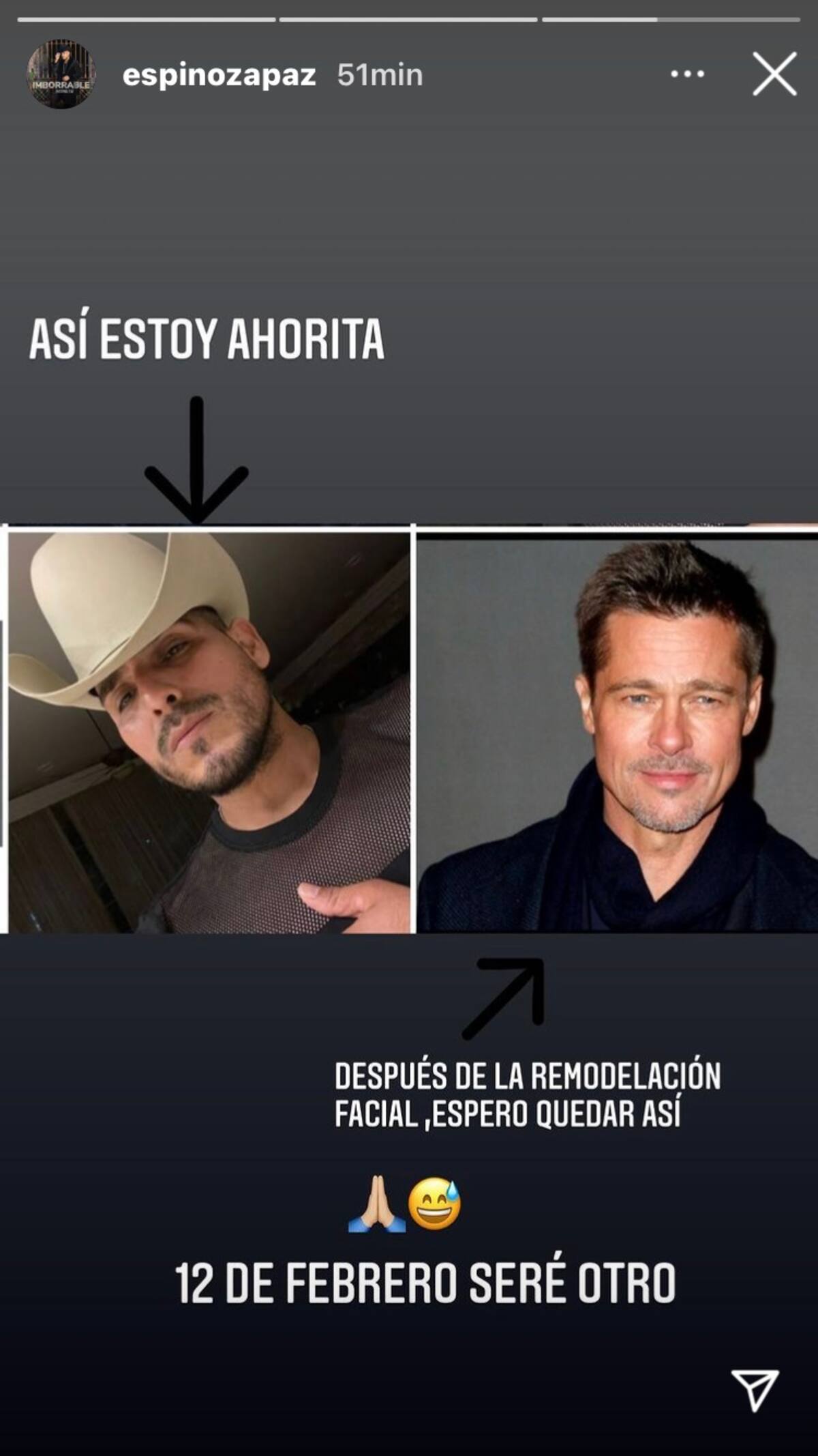 Tijuana, BC.- El cantante Espinoza Paz, quien ha estado muy hermético esta temporada de pandemia y metido en su estudio de grabación, compartió en su cuenta de Instagram, que con unos arreglitos que se hará pretende quedar como Brad Pitt para el 12 de febrero.