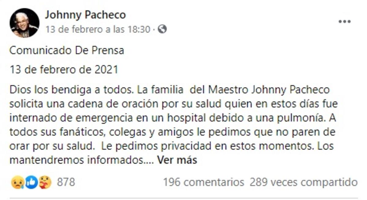 Con gran dolor en mi alma y un vacío en mi corazón les comunico que el maestro Johnny Pacheco con mucha paz falleció esta tarde. Mil gracias por todas sus oraciones y todo el amor que siempre le brindaron", reza el texto de la red social. En estos momentos les pedimos privacidad y oraciones. Cuqui Pacheco y familia”, reza el texto.