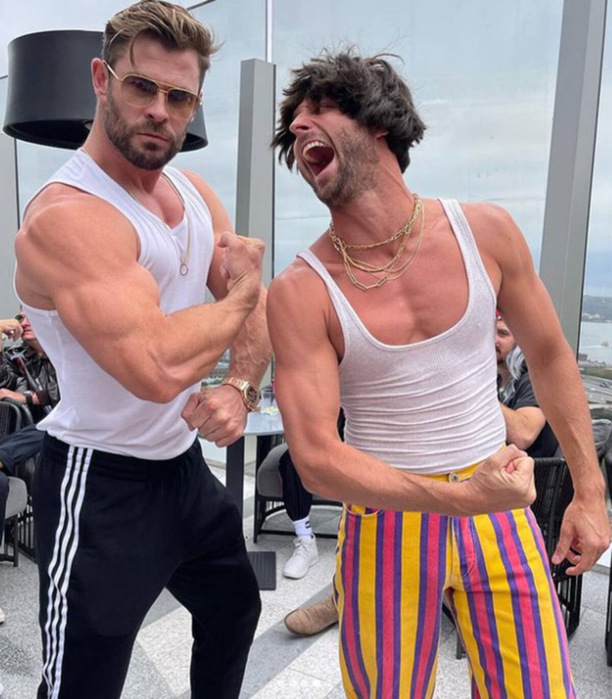 Por su parte, el intérprete de Thor, ha recurrido a un chándal de la época con una camiseta de tirantes que resalta sus pronunciadísimos músculos. Por si alguien no se había dado cuenta de las dimensiones de sus biceps, en otra de las imágenes muestra divertido junto a un amigo los impresionantes resultados de sus entrenamientos.