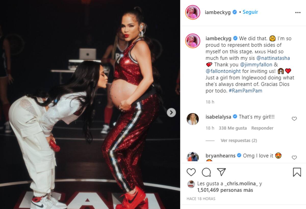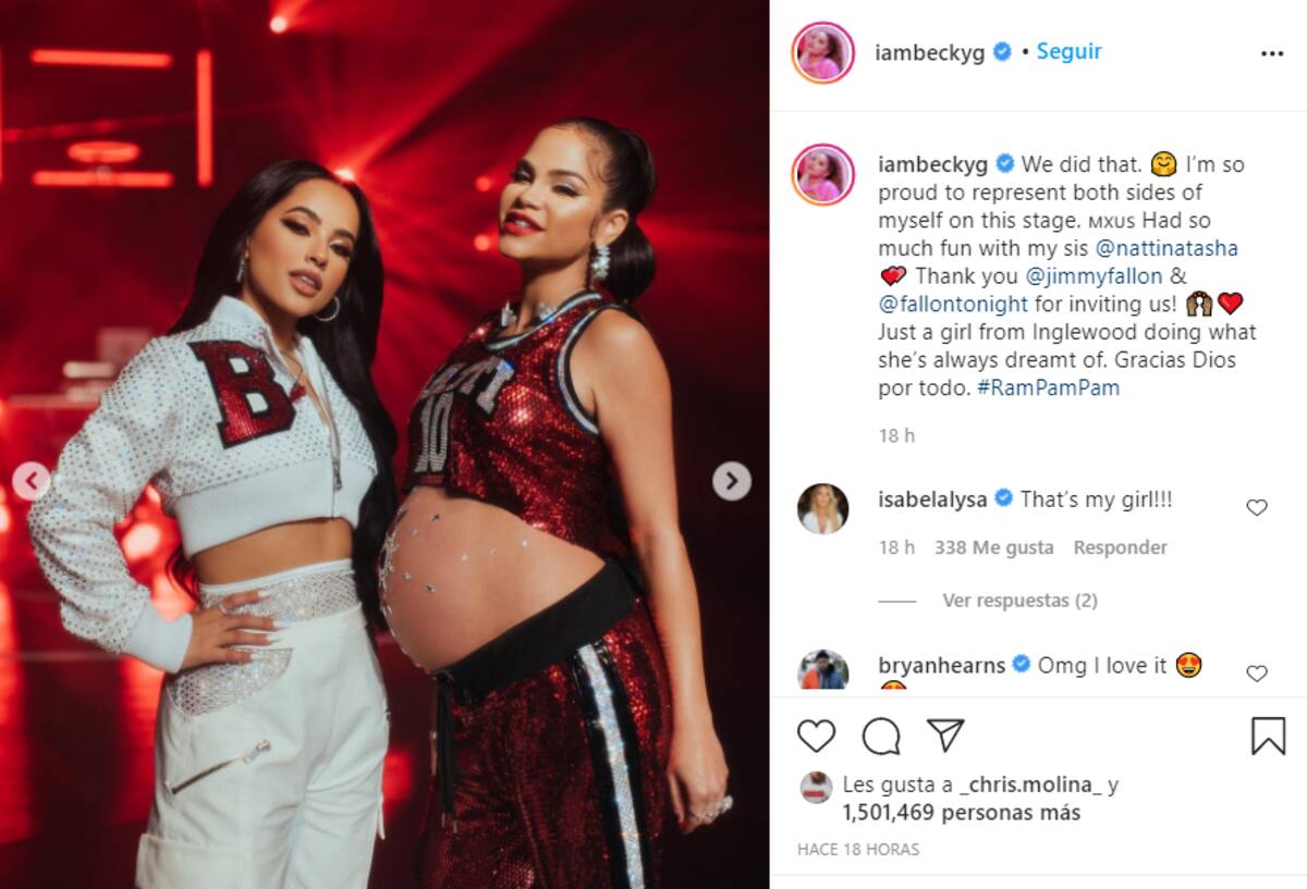 Becky G y Natti Natasha, quien está en su semana 39 de embarazo, presentaron su éxito “Ram Pam Pam” en el programa de Jimmy Fallon.
