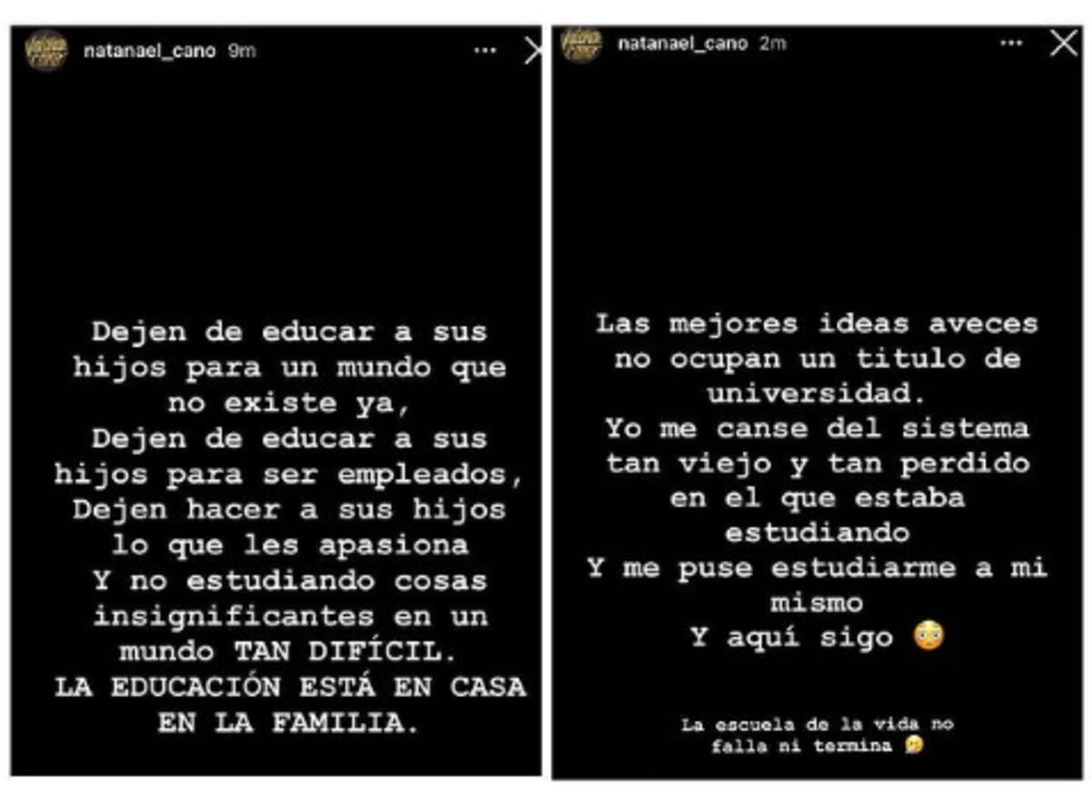 “Dejen de educar a sus hijos para un mundo que no existe ya. Dejen de educar a sus hijos para ser empleados. Dejen hacer a sus hijos lo que les apasiona y no estudiando cosas insignificantes en un mundo TAN DIFÍCIL. LA EDUCACIÓN ESTÁ EN CASA EN LA FAMILIA”, escribió el joven de 20 años en una de sus historias de Instagram.