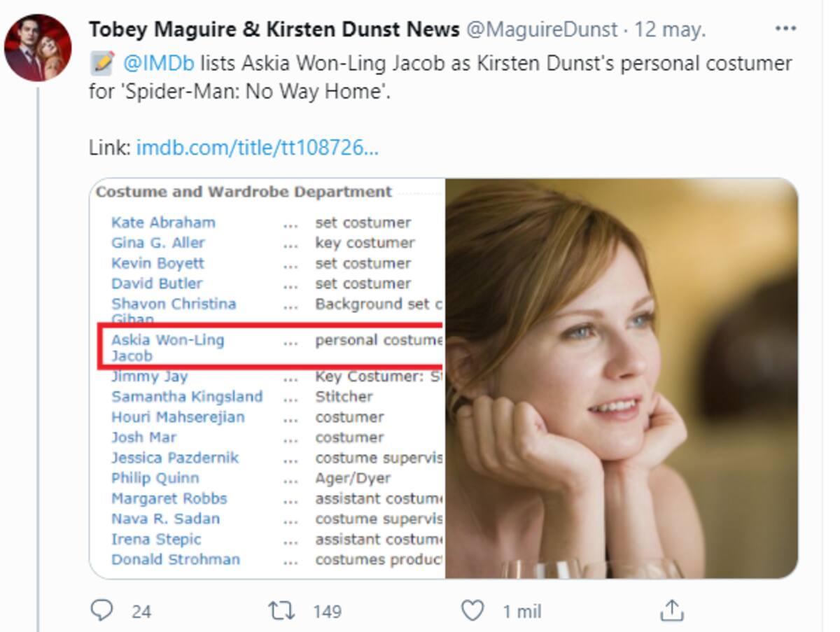 Los rumores comenzaron con una imagen compartida por la cuenta de Twitter Tobey Maguire & Kirsten Dunst News, la cual es una captura de pantalla en la que aparece Askia Won-Ling como asistenta de vestuario de Dunst.