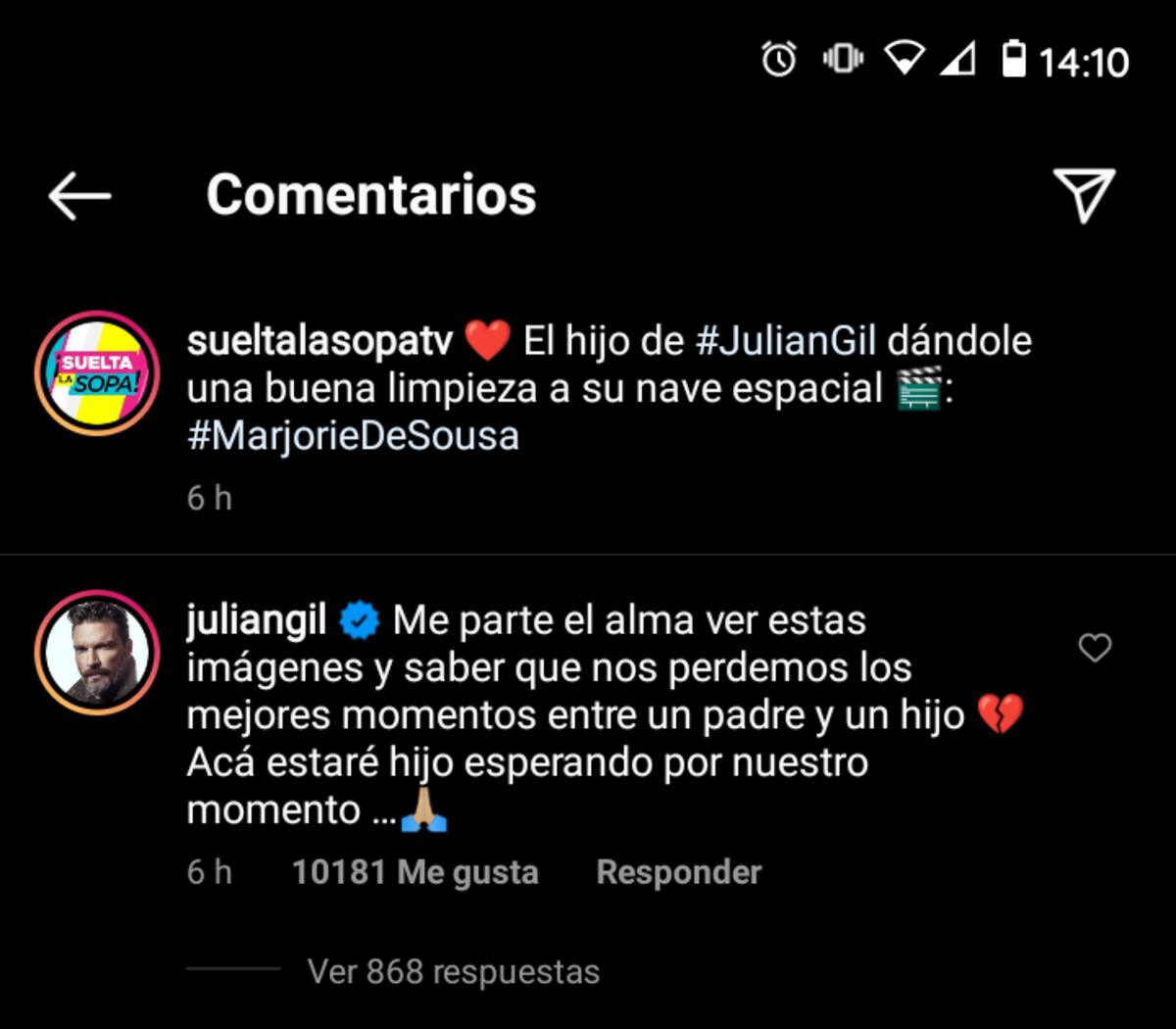 Fue ahí que Julián Gil comentó la publicación con un mensaje en el que externó su tristeza por estar lejos de Matías.