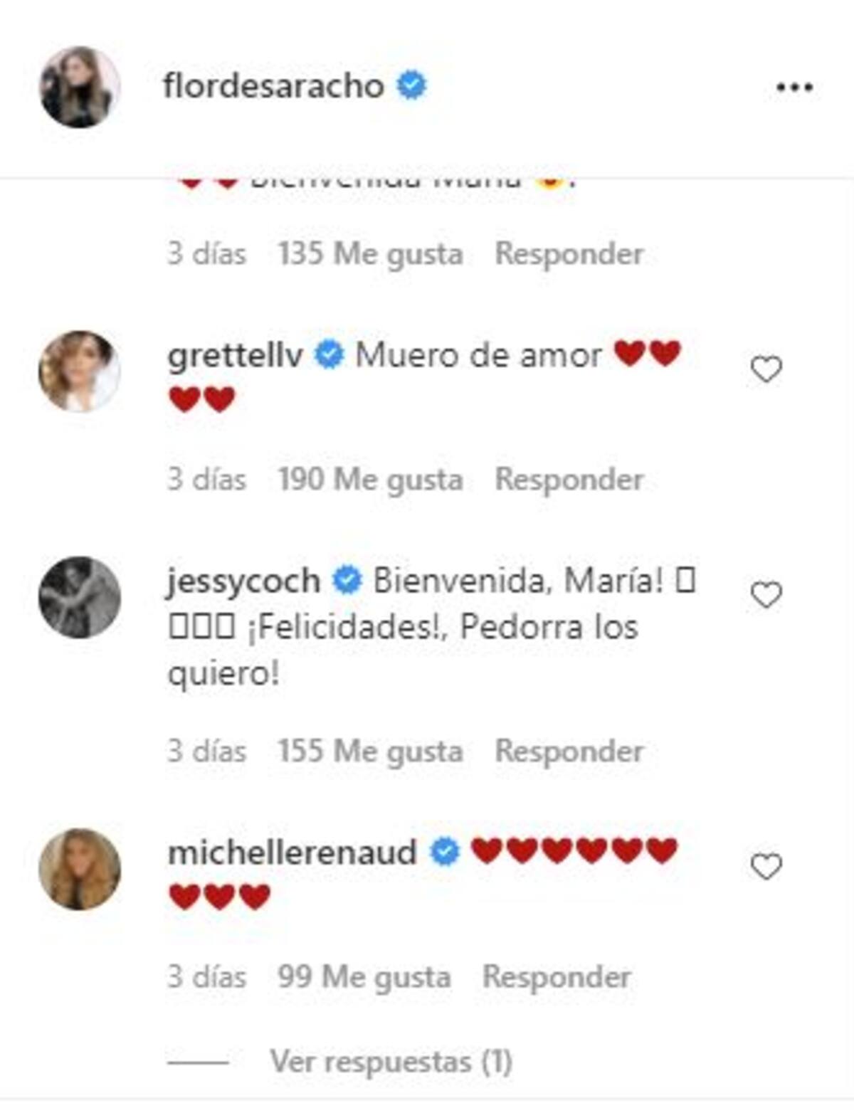 La buena nueva sorprendió a los seguidores de la actriz, de 39 años, ya que esperaban con ansias la llegada de María, incluyendo a varios famosos quienes en la bandeja de comentarios le dejaron sus buenos deseos y congratulaciones.