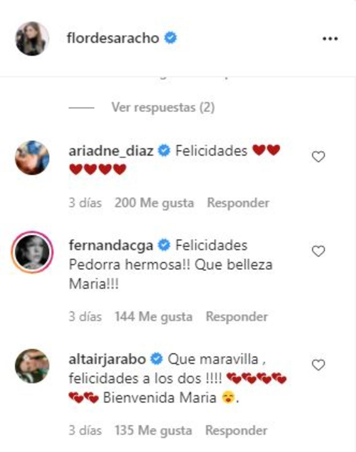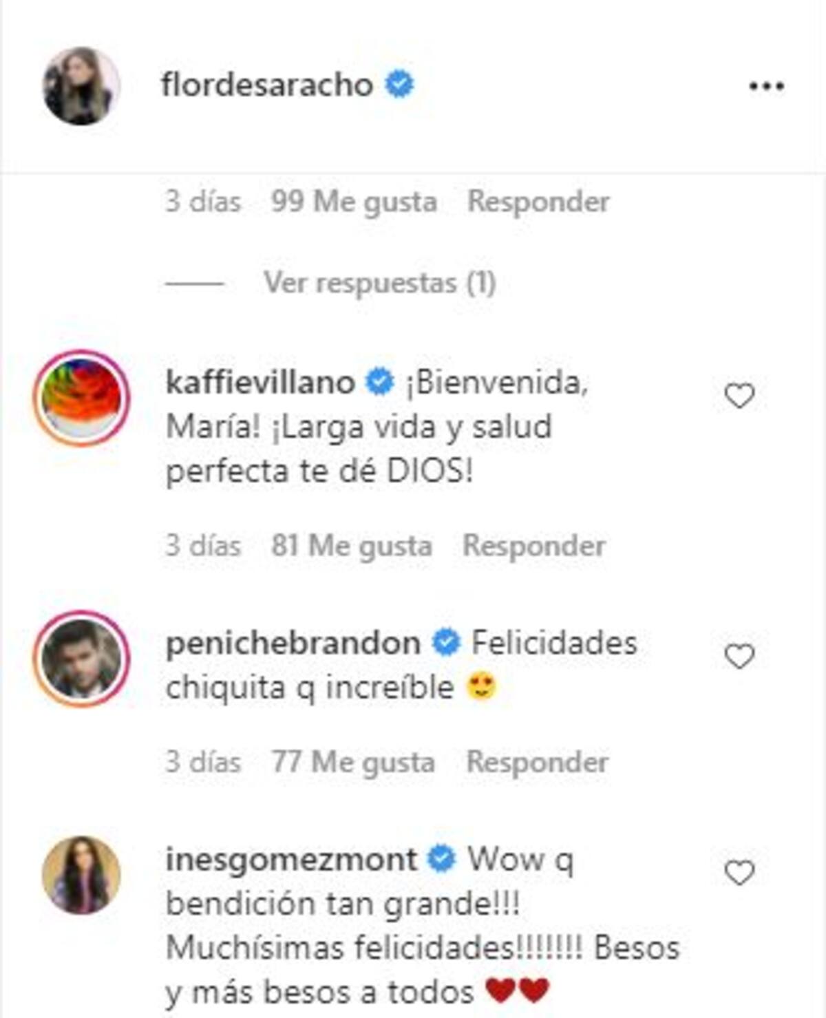 Entre las estrellas que felicitaron a Florencia y a su familia se encuentran Jacky Bracamontes, Ariadne Díaz, Altair Jarabo, Fernanda Castillo, Gretel Valdez, Jessica Coch, Michelle Renaud, Alex Kaffie, Brandon Peniche, Inés Gómez Mont, entre muchos otros.