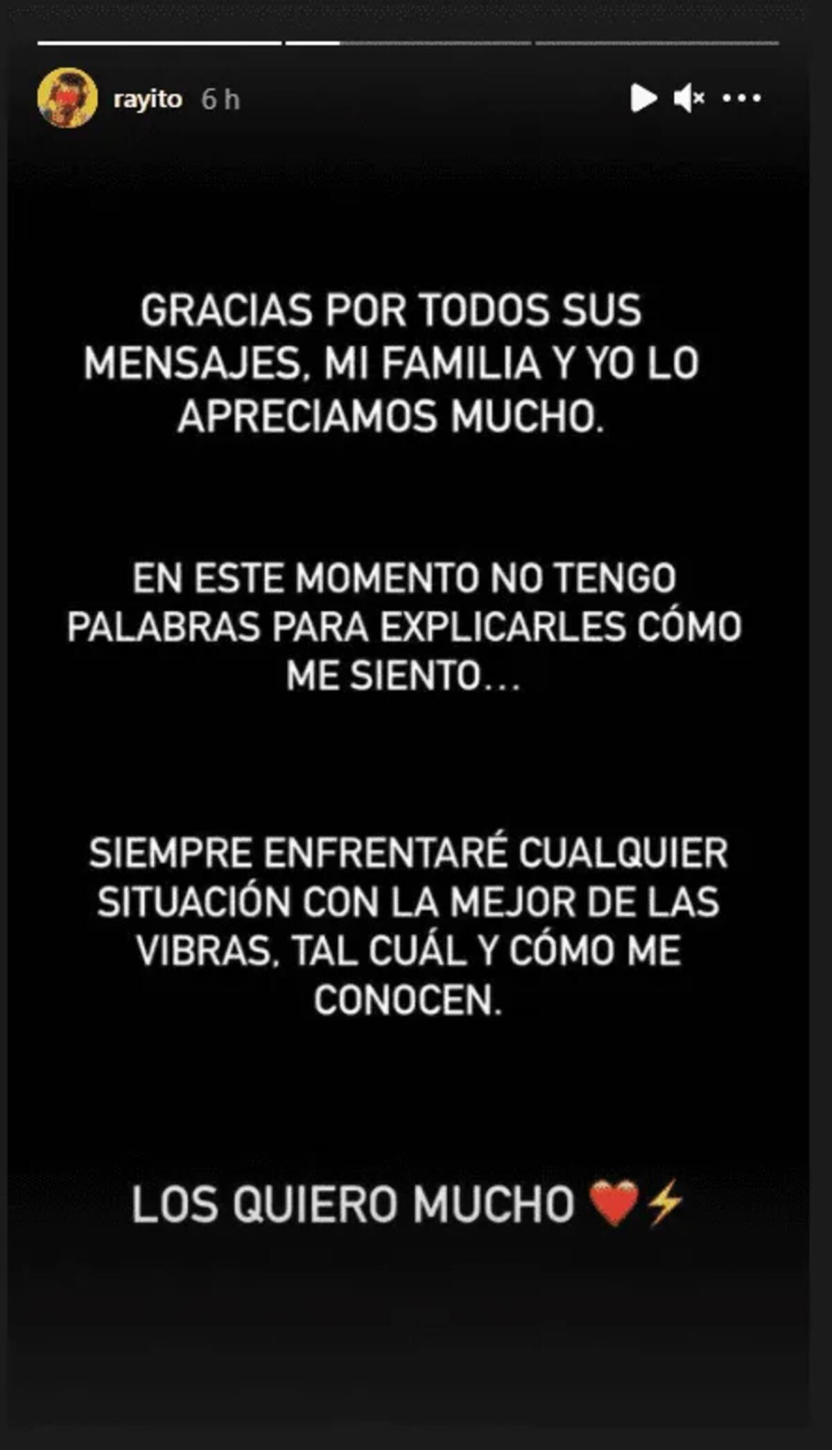 “Gracias por todos sus mensajes. Mi familia y yo los apreciamos mucho. En este momento no tengo palabras para explicarles cómo me siento. Siempre enfrentare cualquier situación con la mejor de las vibras. Tal cual y cómo me conocen”, escribió.