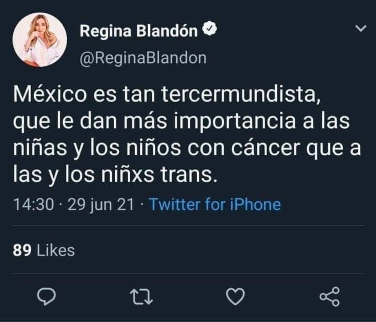 CIUDAD DE MÉXICO.- Regina Blandón enfureció en redes sociales al enterarse que en Twitter circulaba un mensaje que supuestamente ella había publicado y después borrado, en el que se refiere a México como un país tercermundista por no ser inclusivo e importarle más los niños con cáncer.