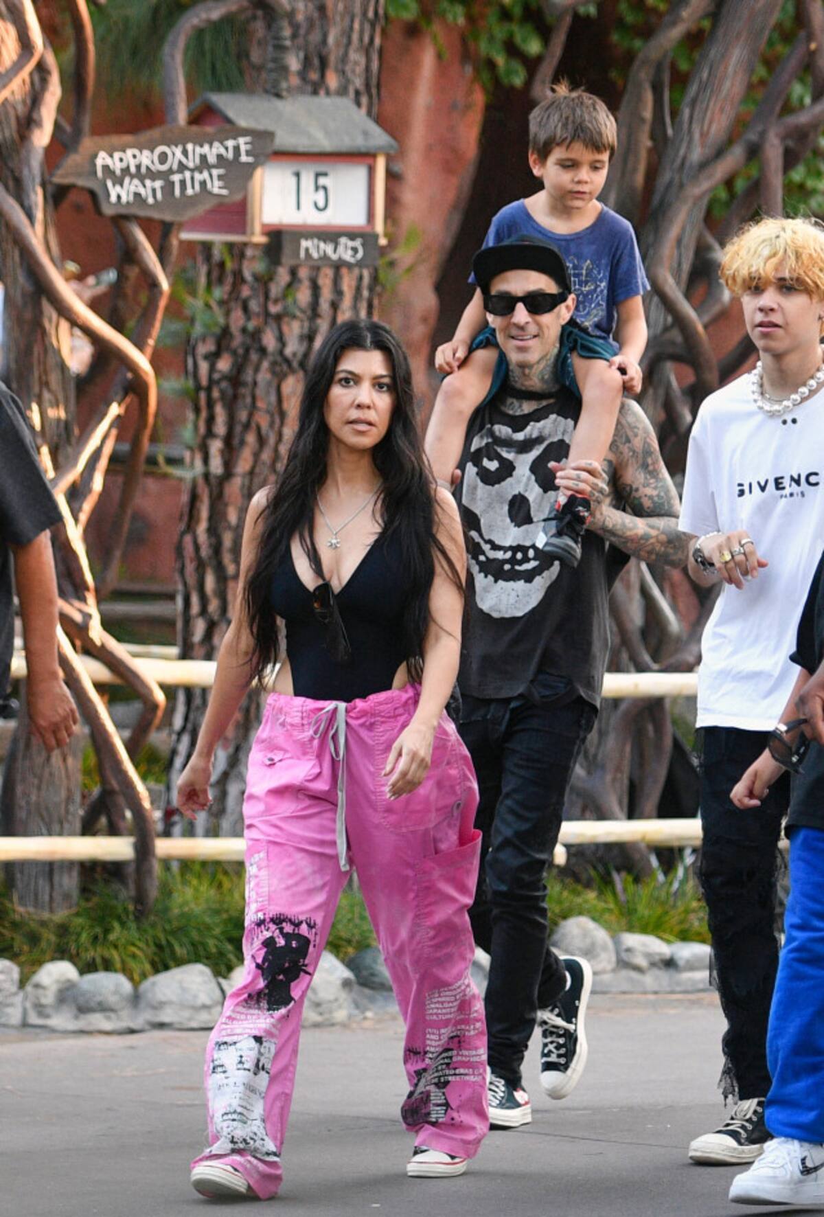 Kardashian fue visto de la mano de Barker, de 45 años, mientras recorrían el parque con Alabama y su hijo de 17 años, Landon, a quien comparte con su ex esposa Shanna Moakler. El ex E! Los hijos de la personalidad, Mason, de 11 años, y Reign, de 6, a quien comparte con su ex novio Scott Disick, también estuvieron presentes, pero su hija de 8 años, Penelope, no.