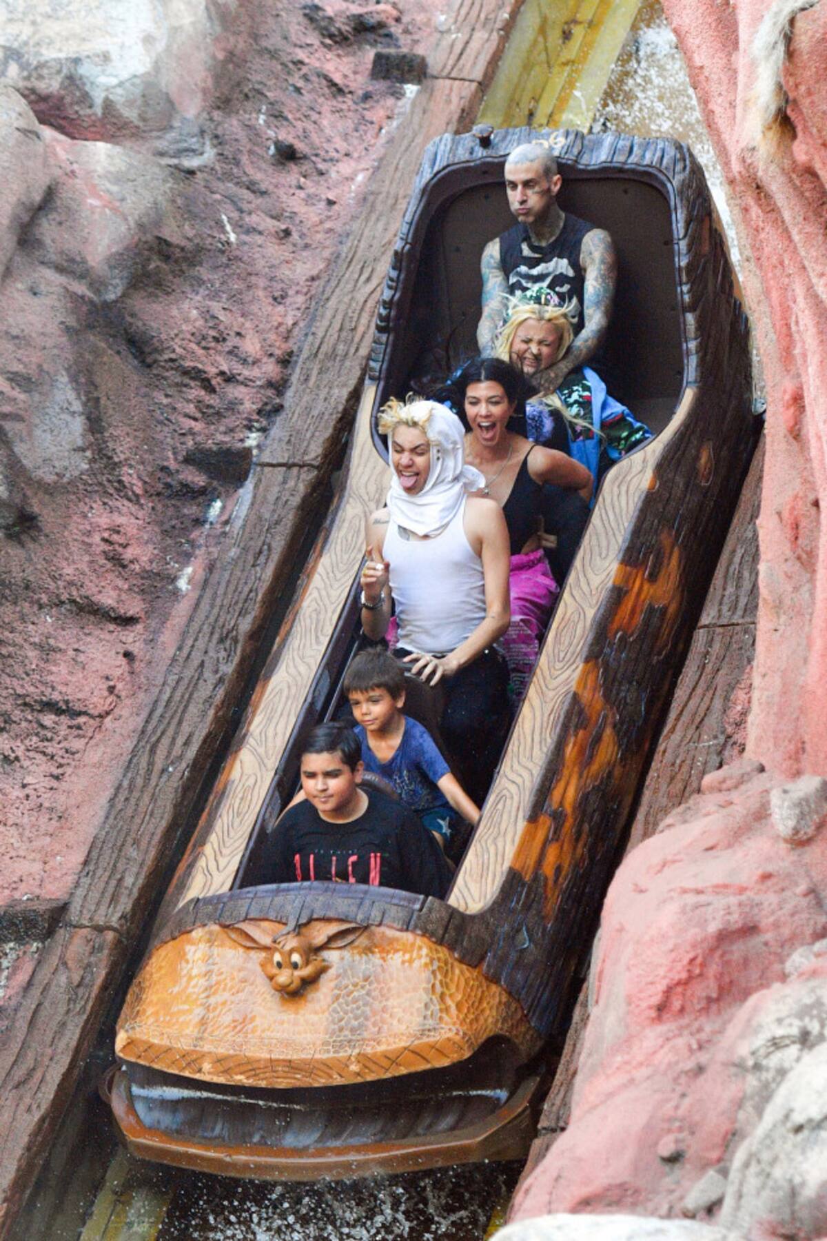 El grupo parecía una gran familia feliz durante su salida del 4 de julio mientras recorrían el tobogán de troncos y caminaban por Disneylandia con un guía. En un momento, el baterista de Blink-182 incluso cargó a Reign sobre sus hombros.