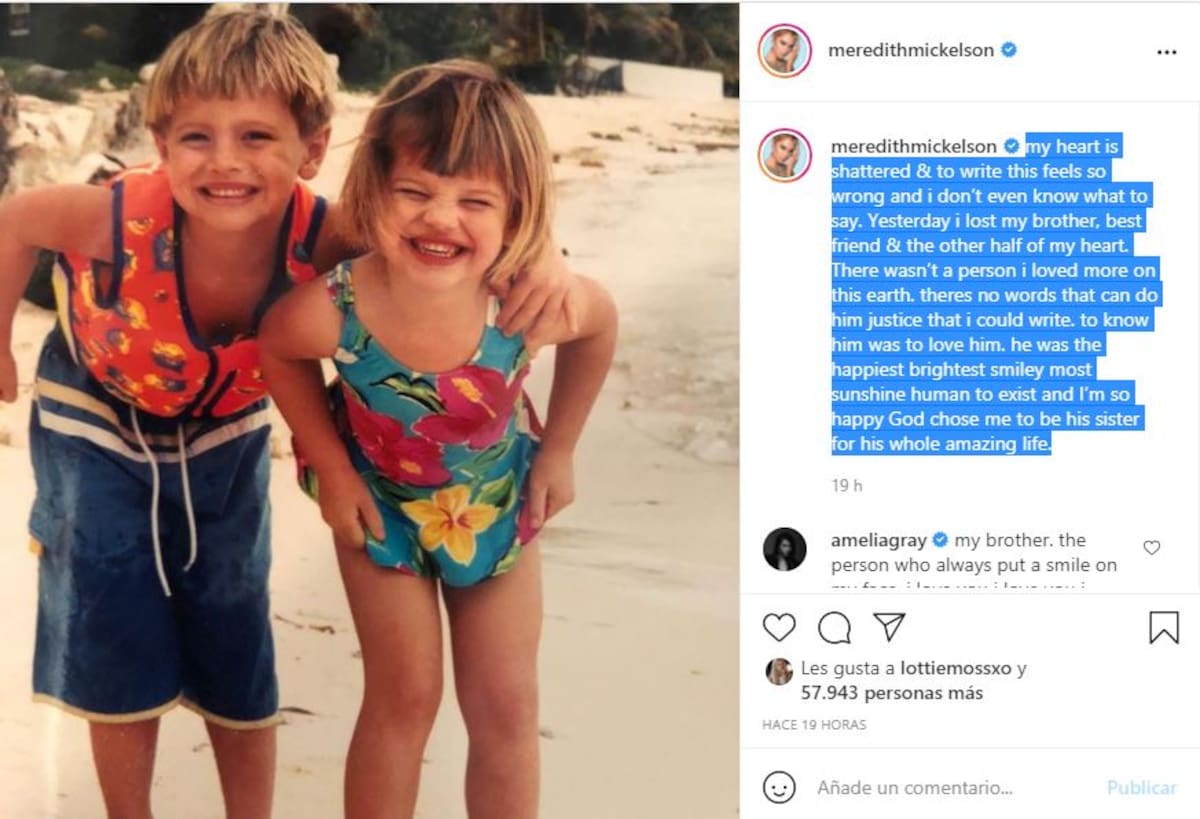 Mi corazón está hecho añicos y escribir esto se siente tan mal y ni siquiera sé qué decir. Ayer perdí a mi hermano, mejor amigo y la otra mitad de mi corazón. No había una persona a la que amase más en esta tierra. No hay palabras que puedan hacerle justicia que yo pueda escribir”, reza parte del mensaje de Meredith.