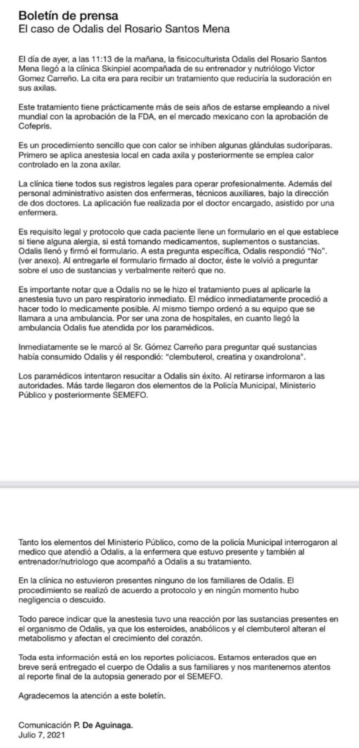 Luego de trascender el fallecimiento de Odalis, la clínica Skin Piel Wellness Center publicó un comunicado en el que se defendió de los ataques en las redes sociales.