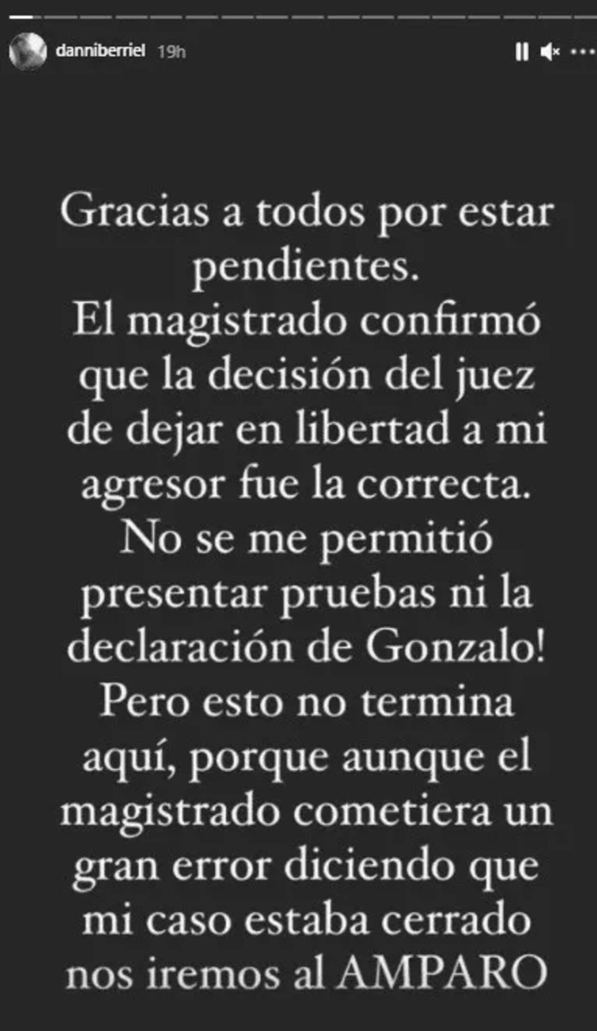 Por otro lado, Daniela Berriel mostró su indignación en redes sociales por la decisión de dejar en libertad a su agresor debido a que las pruebas presentadas se consideraron insuficientes y no fueron recibidas por el juez.