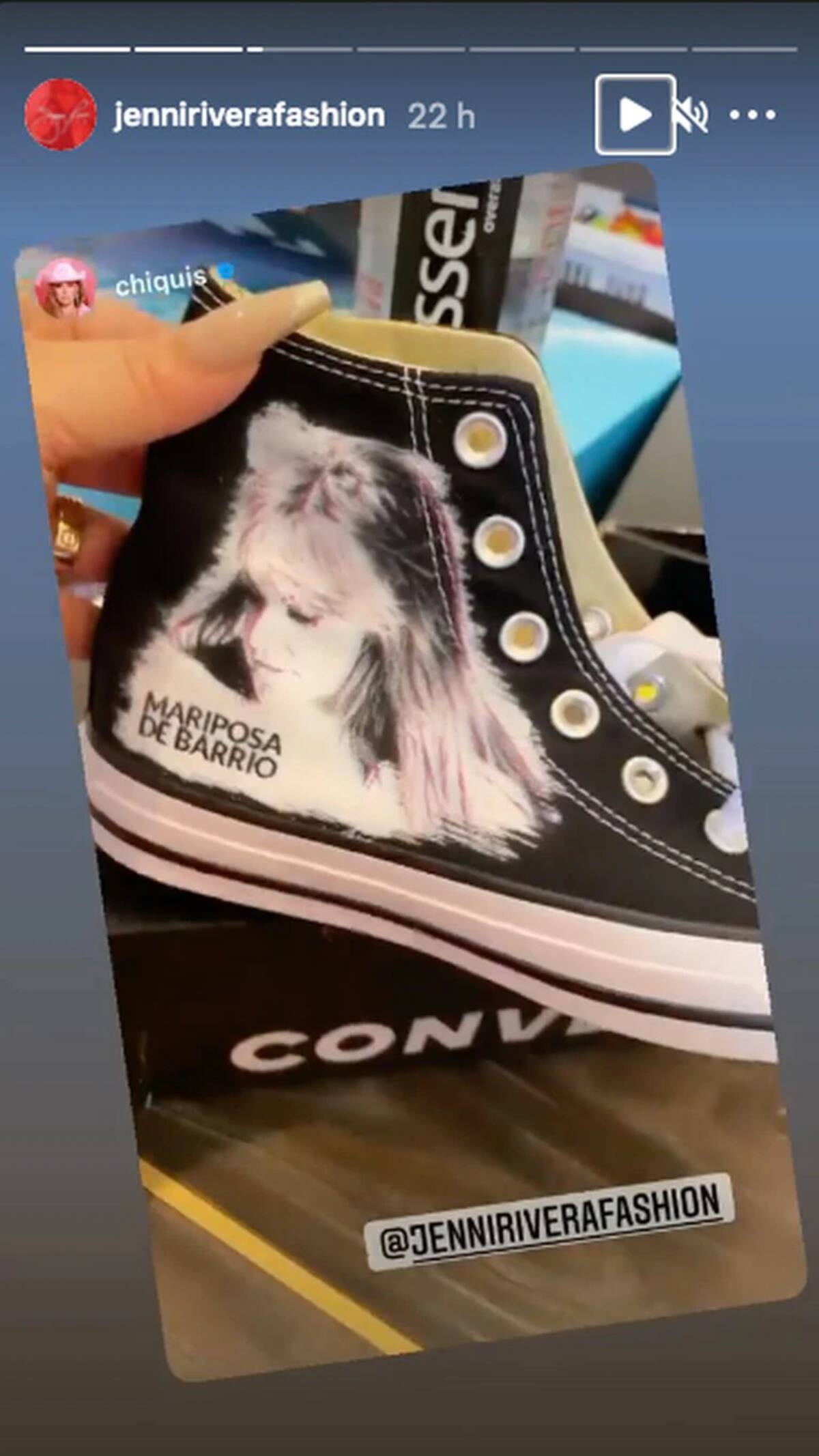 La hija de la “Diva de la Banda” mostró en sus historias de Instagram un tributo a su madre por medio de sus tenis tipo converse color negro. En ellos, tenía marcada la imagen impresa de la intérprete de “Inolvidable” junto a la leyenda “Mariposa de Barrio”.