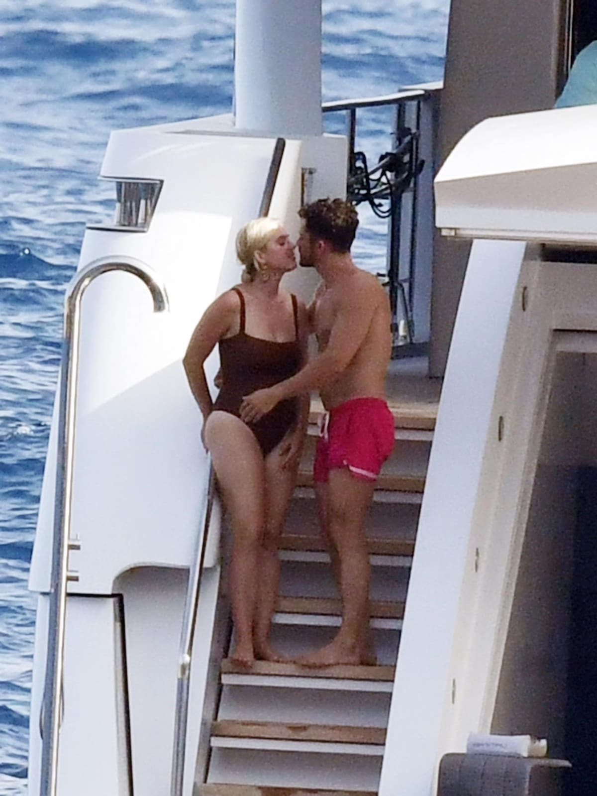 A bordo de un yate en las costas de Captri, Italia, fueron captados los famosos, al tiempo que se dan un apasionado beso parados al borde de la proa del barco, dejando entrever un gesto de lo más travieso por parte de Perry mientras “se come a besos” a su prometido.