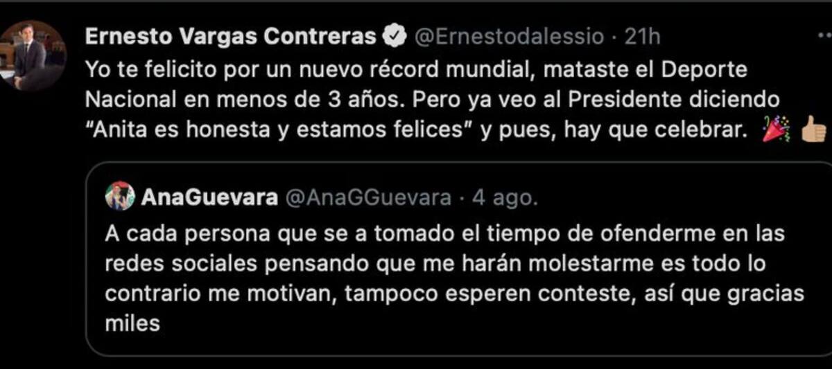 Yo te felicito por un nuevo récord mundial: Mataste el Deporte Nacional en menos de 3 años. Pero ya veo al presidente diciendo ‘Anita es honesta y estamos felices’, y pues, hay que celebrar”, tuiteó Ernesto.