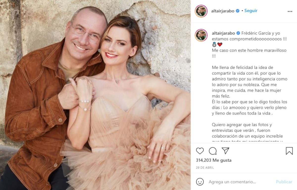 "Quiero compartirles una noticia muy especial. Frèdèric García y yo estamos comprometidooooooooos. Me caso con este hombre maravilloso. Me llena de felicidad la idea de compartir la vida con él, porque lo admiro tanto por su inteligencia como lo adoro por su nobleza. Que me inspira, me cuida, me hace la mujer más feliz. Él lo sabe porque se lo digo todos los días: Lo amoooo y quiero verlo pleno y lleno de sueños toda la vida", se lee.