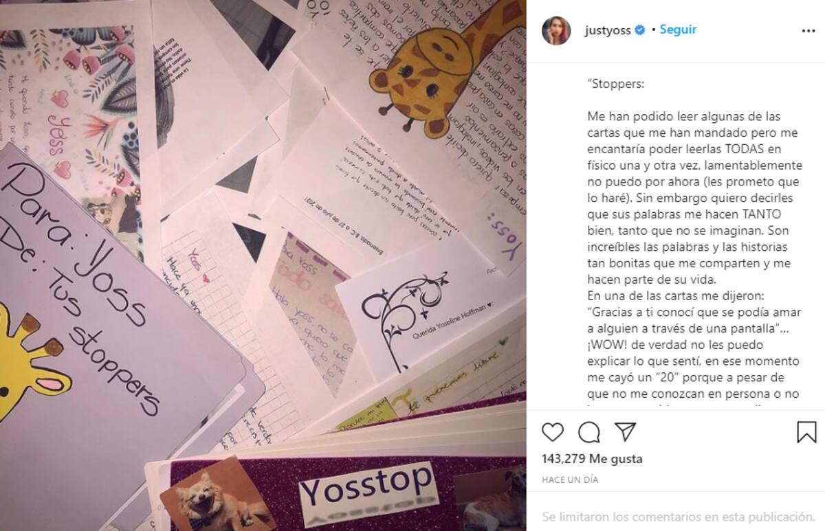 Stoppers: Me han podido leer algunas de las cartas que me han mandado pero me encantaría poder leerlas TODAS en físico una y otra vez, lamentablemente no puedo por ahora (les prometo que lo haré). Sin embargo quiero decirles que sus palabras me hacen TANTO bien, tanto que no se imaginan. Son increíbles las palabras y las historias tan bonitas que me comparten y me hacen parte de su vida”, se lee al inicio de la imagen.
