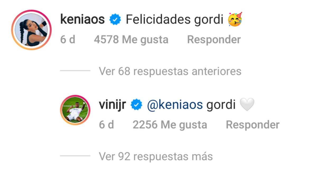 "Felicidades Gordi", fue el cariñoso comentario que le dejó la cantante, segudio de un emoji de celebración. El futbolista no tardó en responder el cumplido y le escribió "Gordi" con un corazón blanco. Al parecer es el apodo con el que la pareja se ha bautizado y que ha despertado los rumnores de romance. De inmediato, los usuarios de la red social respondieron a Kenia para interrogarla sobre la naturaleza del curioso apodo. "¿Cómo que Gordi?", “Kenia hermosa, con que tú estés feliz, todos te apoyaremos” y "¡¡Vivan los novios!!", son algunos de los comentarios de los fans de la cantante.