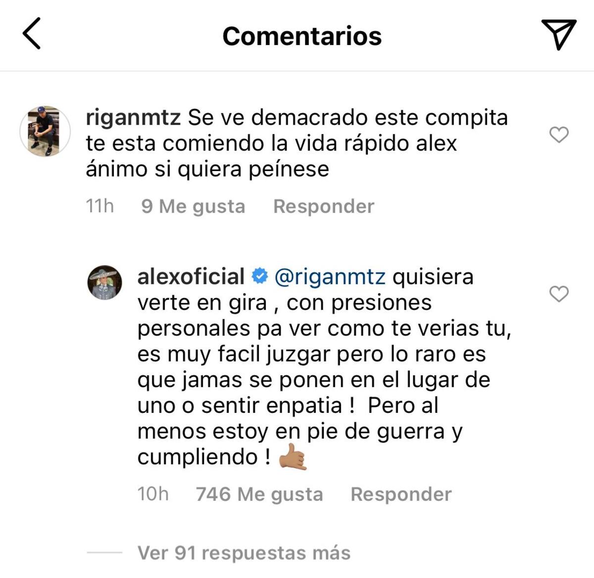 Y eso no fue todo, ya que otro cibernauta también aseguró que el cantante lucía muy demacrado en sus fotos: "Se ve demacrado este compita, te está comiendo la vida rápido Alex, ánimo, siquiera péinese", a lo que Fernández también dio su opinión y respondió que no debería criticar sin empatía, pues no se está poniendo en su lugar al informarse que se encuentra en una gira internacional.